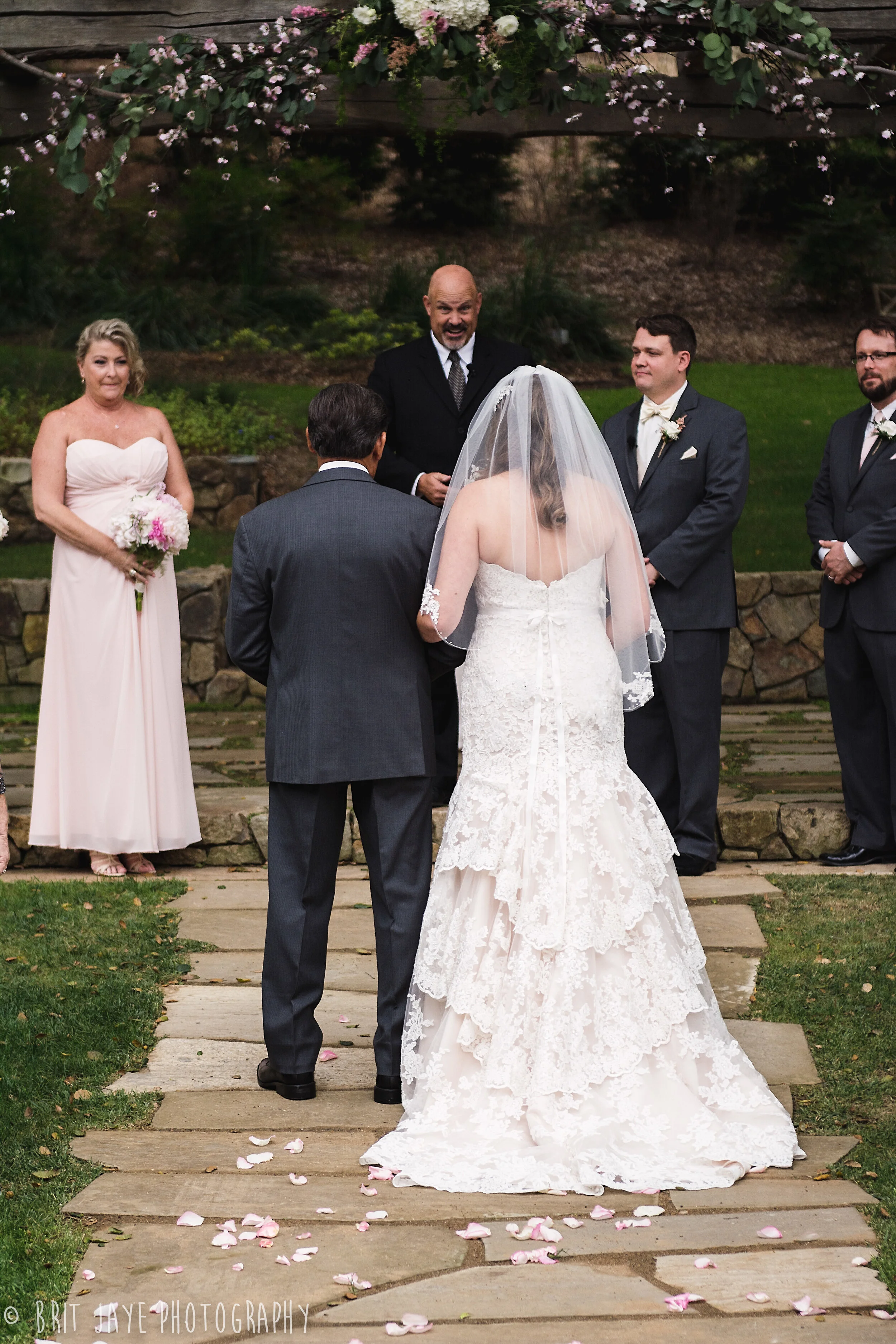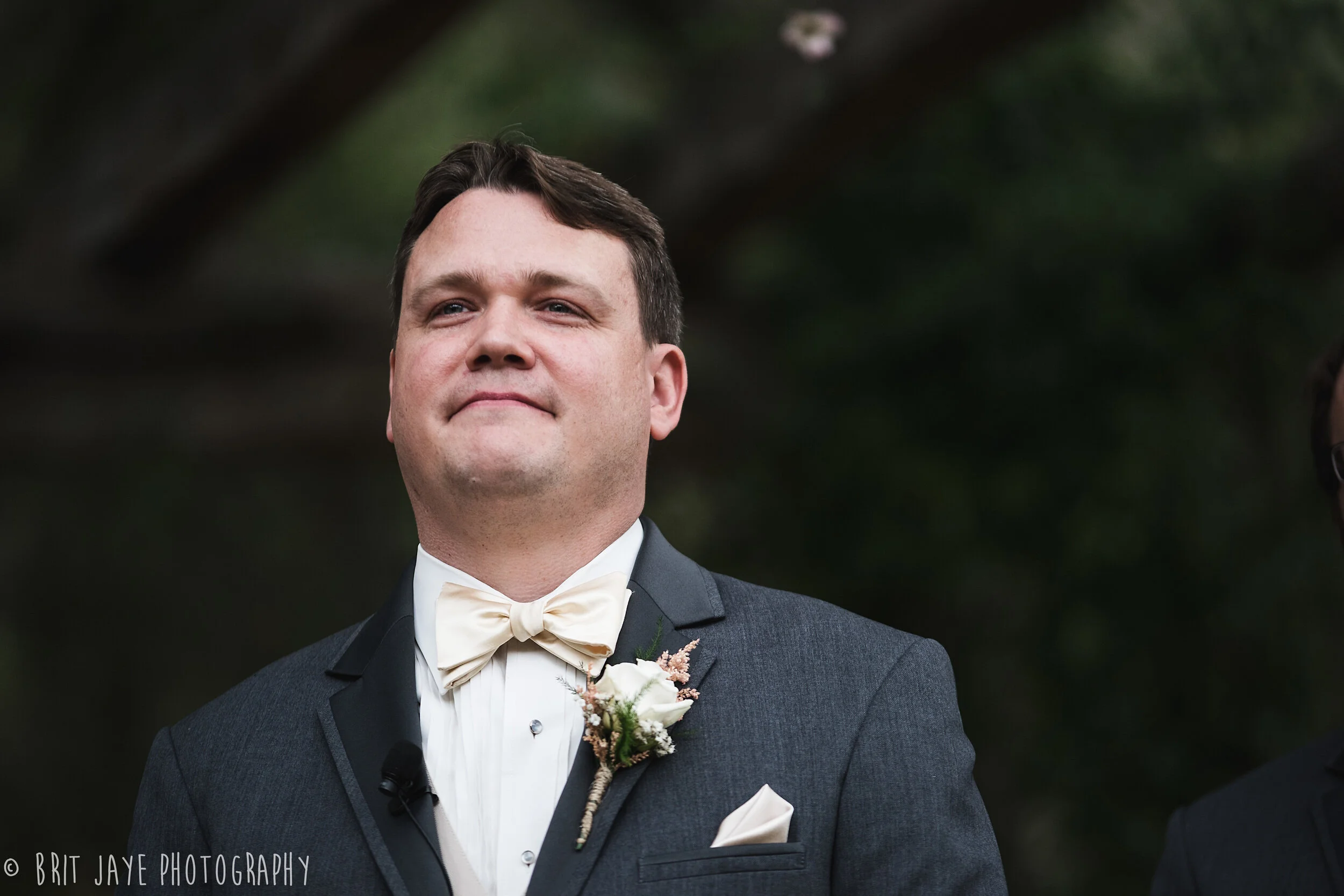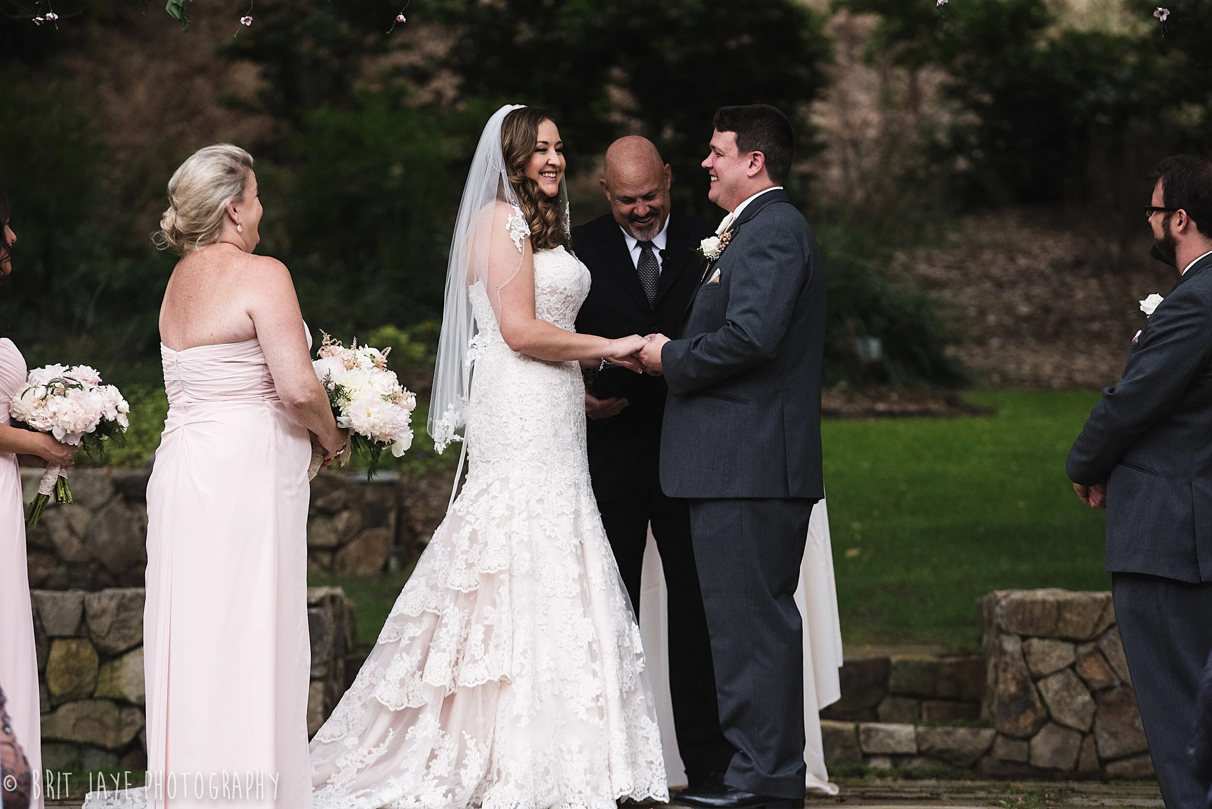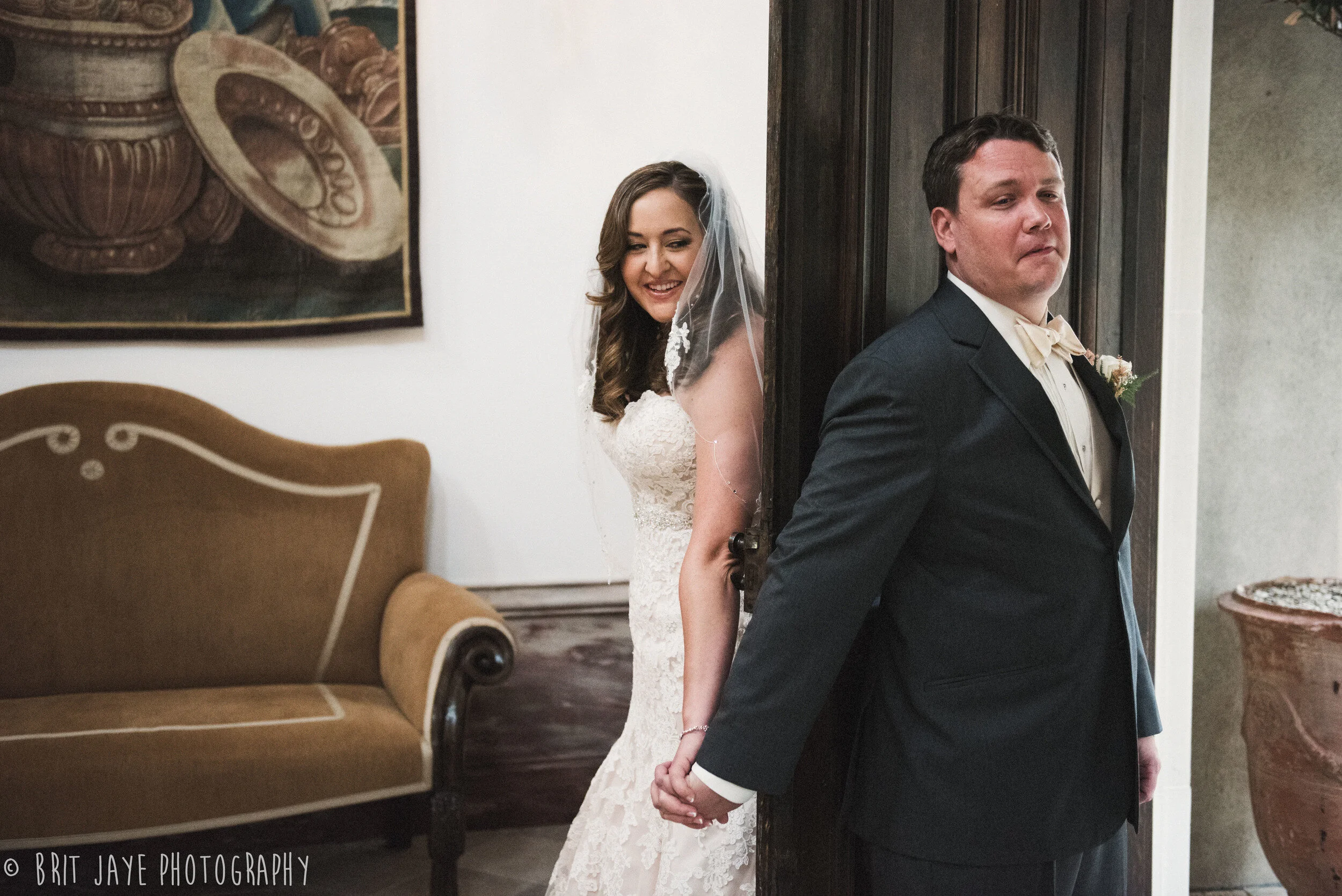 Moments before the ceremony, Kristi & Mike did a partial first look. We positioned them on opposite sides of the gorgeous giant wooden door at the entrance of the country club. They couldn’t actually see each other, but could hold hands and be together for a moment. I love this variation of the first look! It’s really adorable.