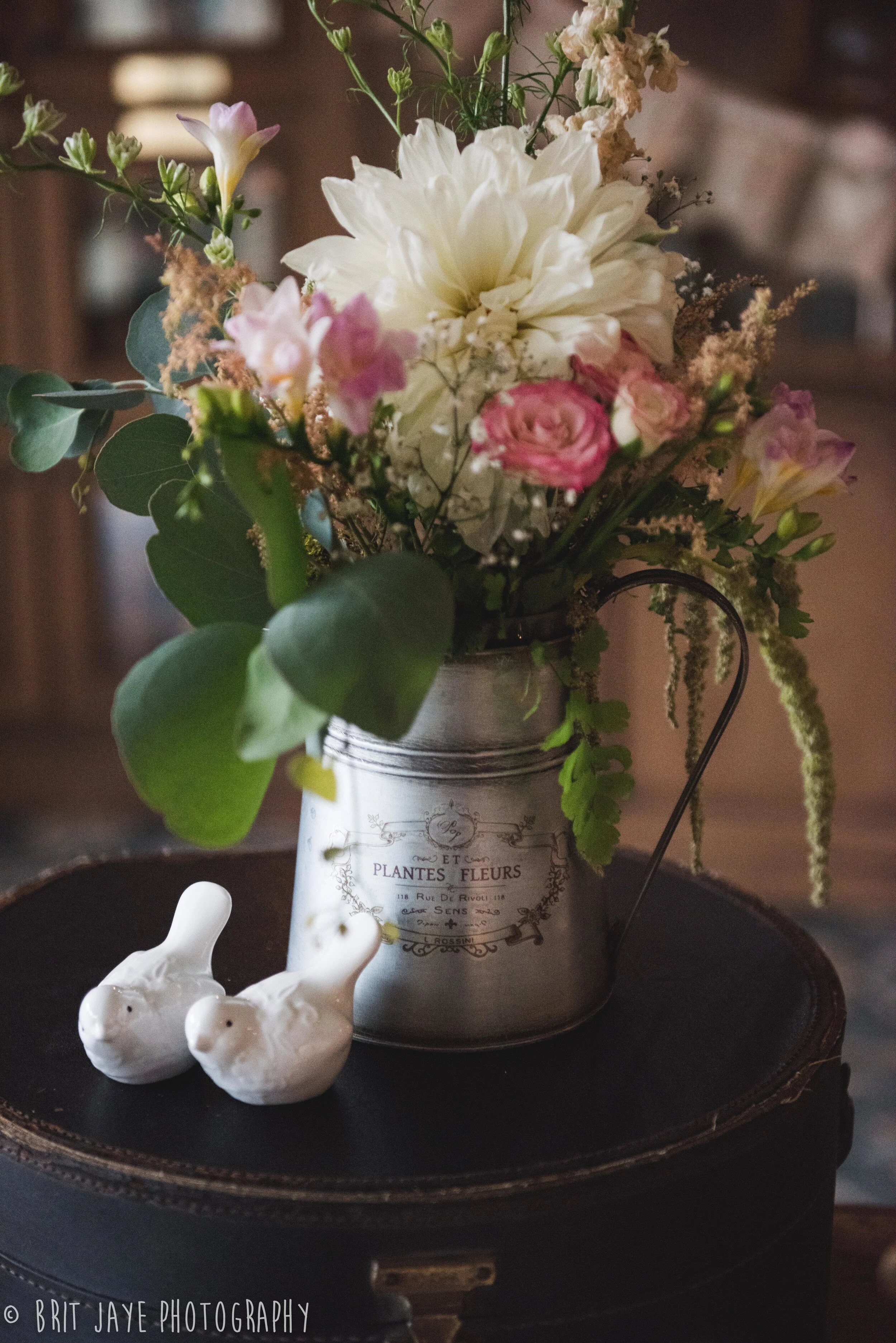 This garden wedding ceremony was absolutely beautiful, and was a great experience for guests. Cold drinks were given to guests as they arrived for the outdoor June ceremony. The garden was decorated with vintage suitcases, and hanging flowers with lovebird details. Gorgeous florals made by Kristin’s sister completed the elegant look for the ceremony space.