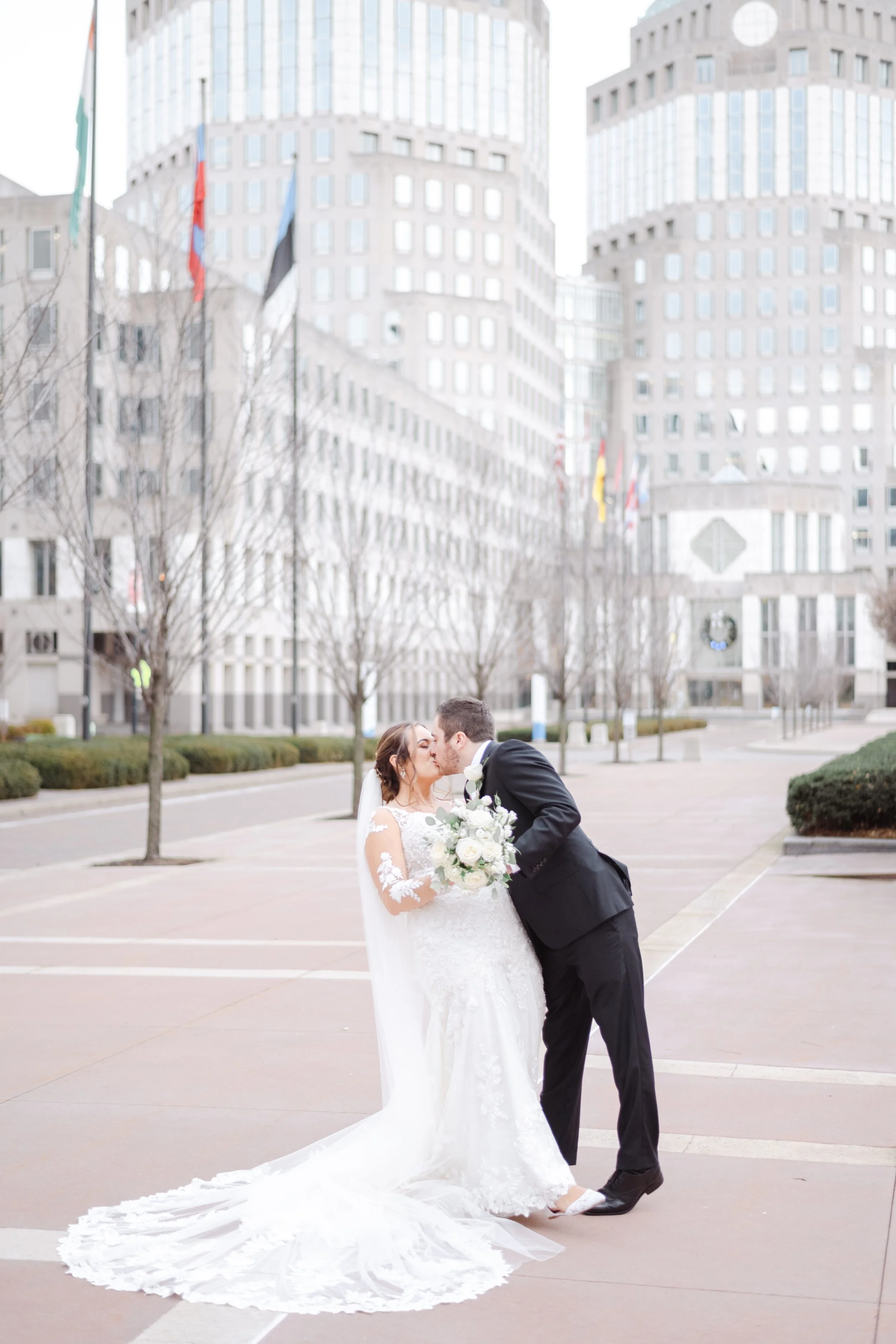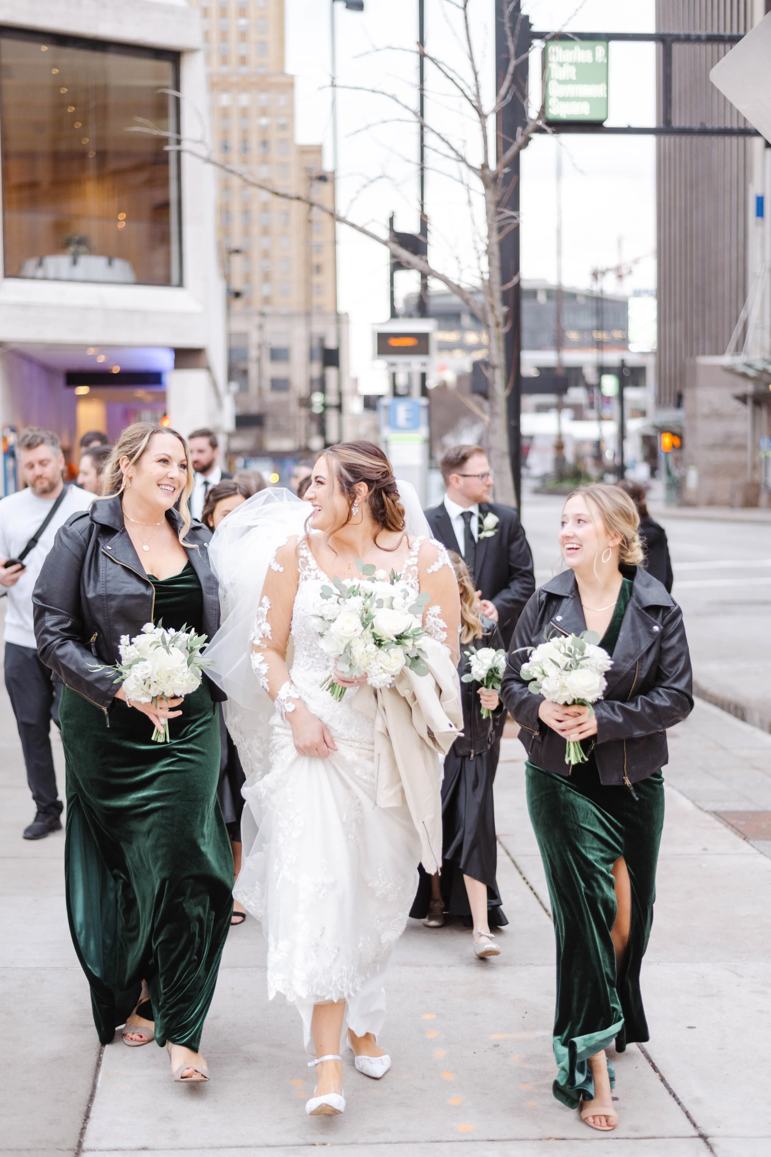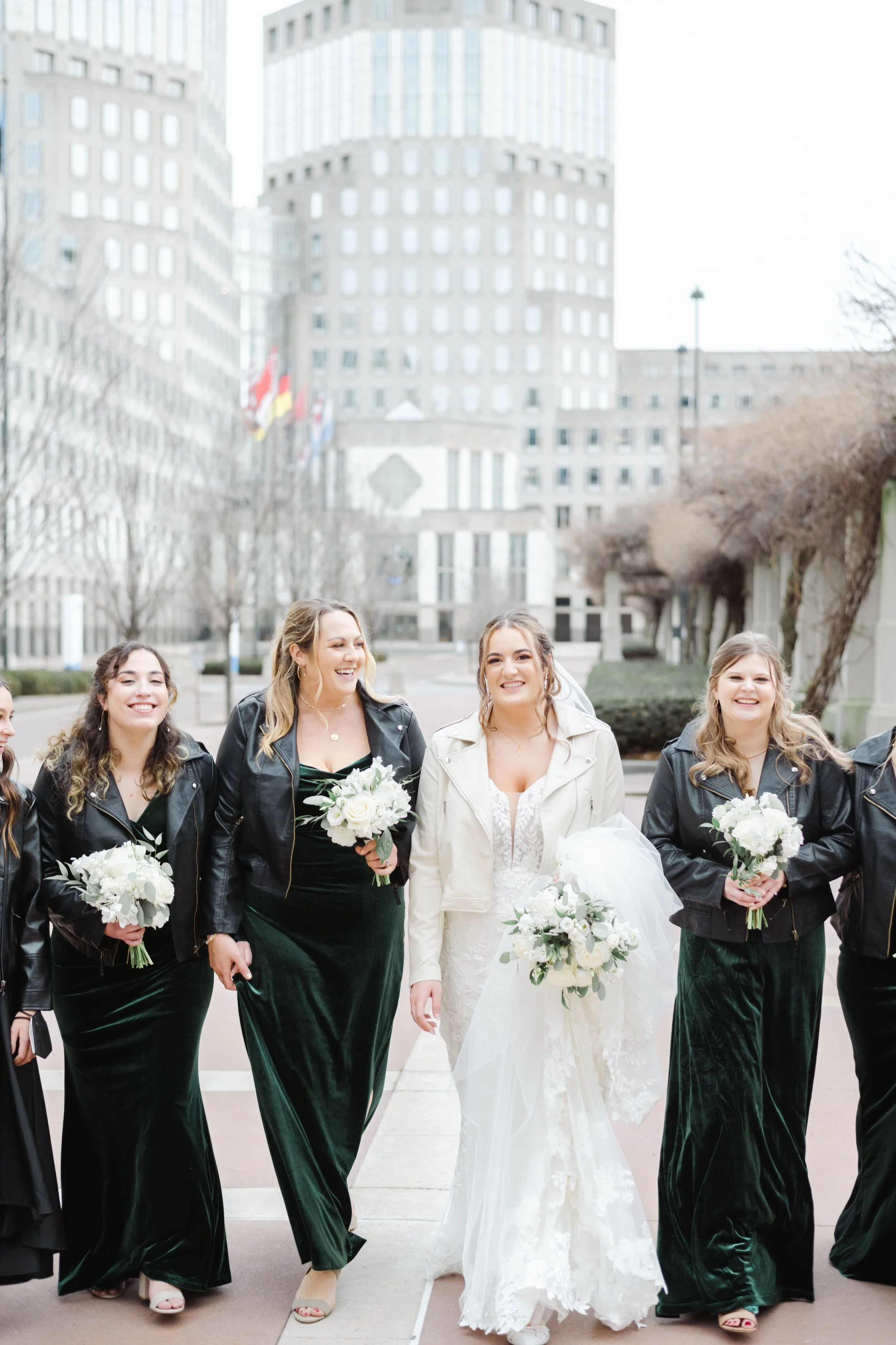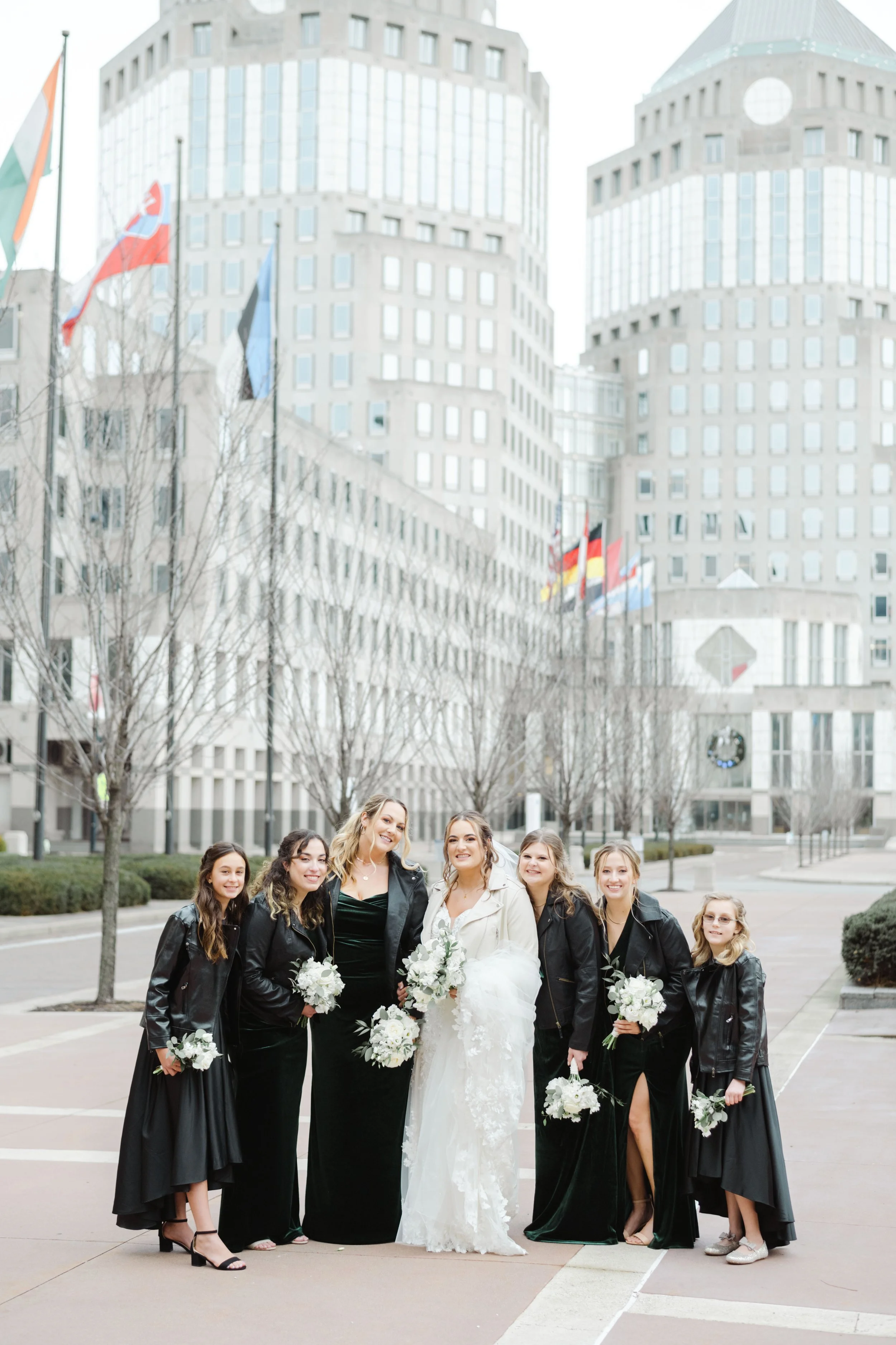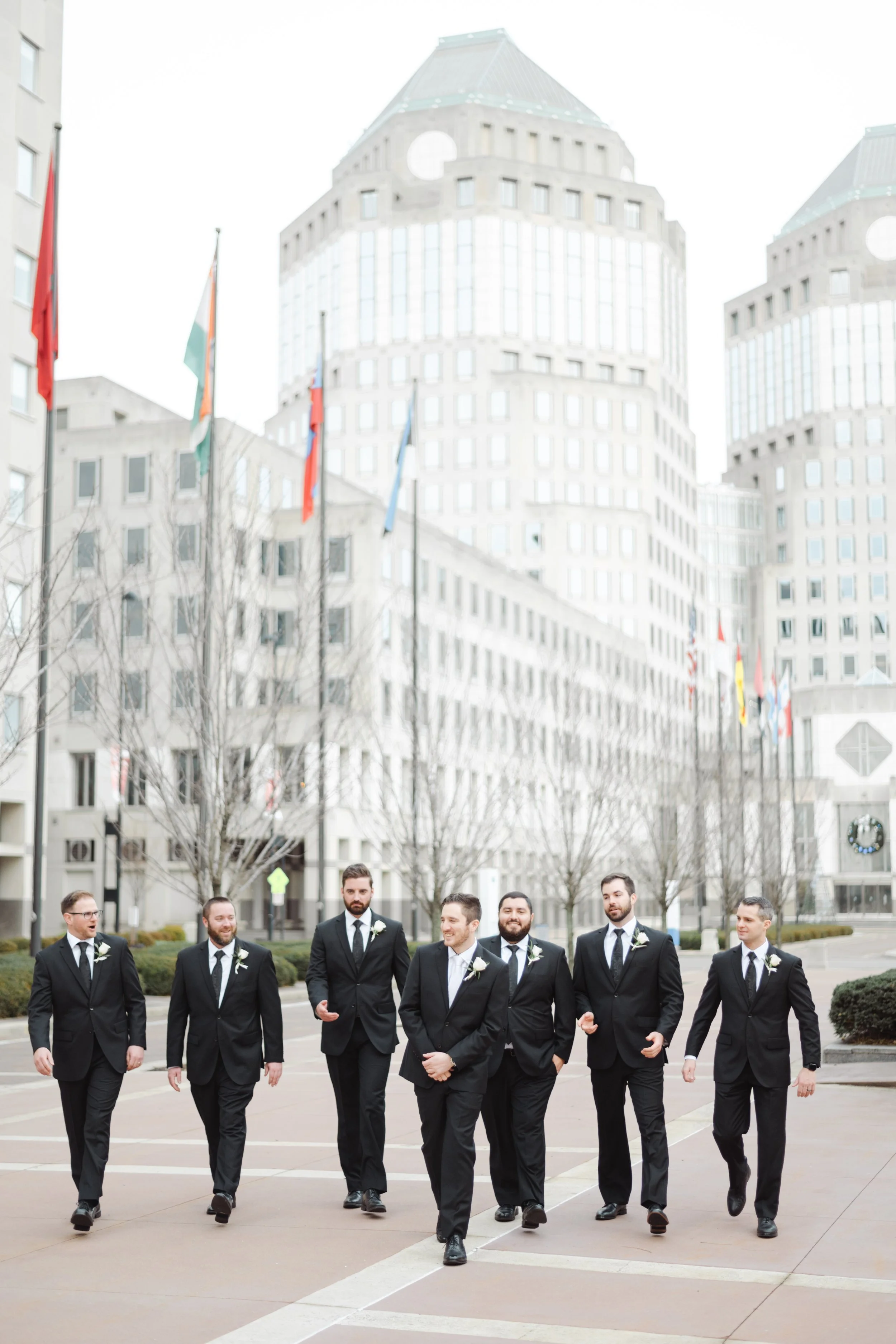 After they were ready, we headed down to their wedding venue- The Center, to have a first look between the bride & groom. We were lucky to experience extremely warm temperatures for a winter wedding, so we then walked around downtown Cincinnati, stopping at some of my favorite spots for photos along the way. The best place to take wedding party photos in downtown Cincinnati is at P & G Park. Although there were lots of other wedding parties with he same idea, the park is quite large and we didn’t have a hard time finding a great location.