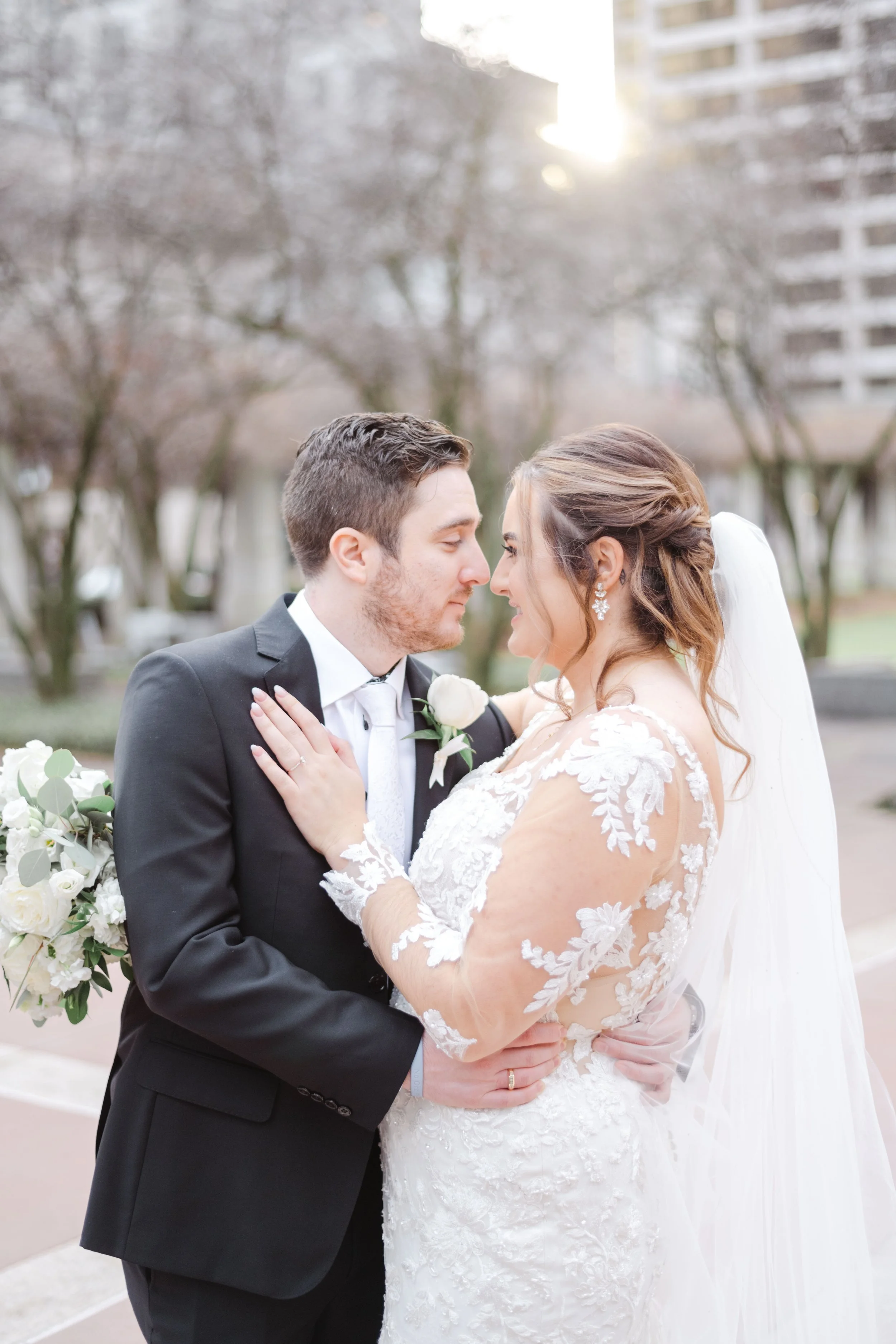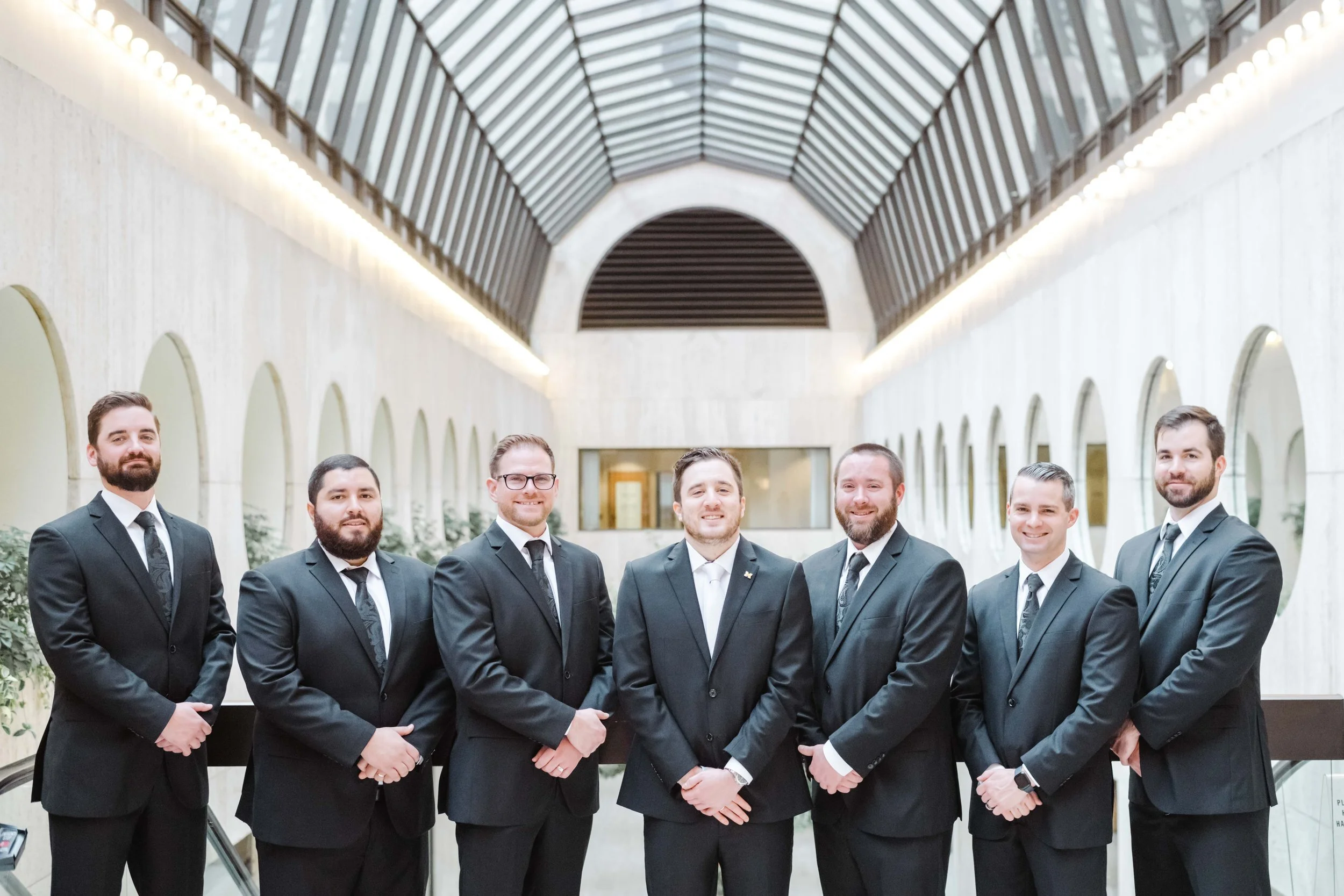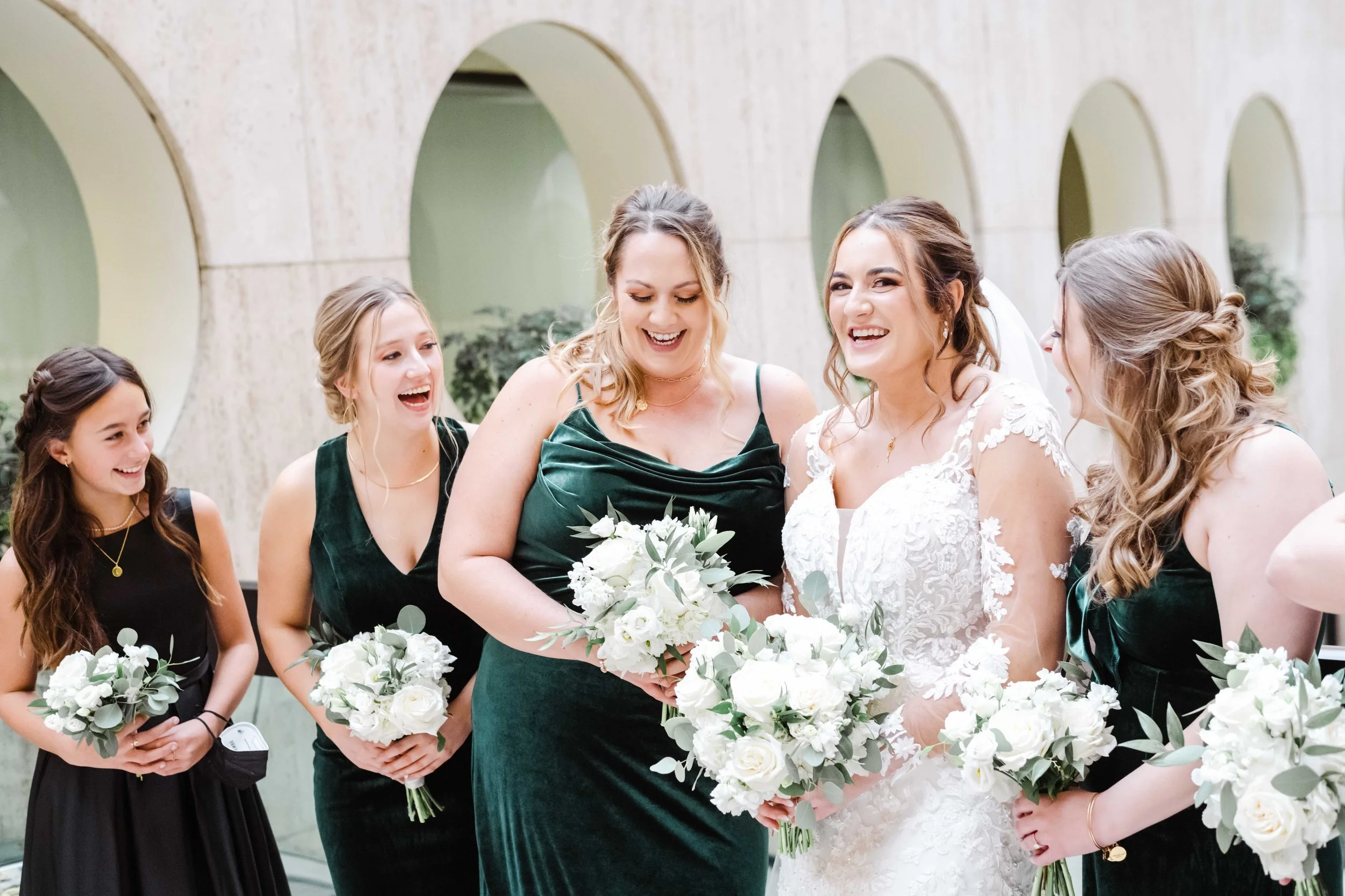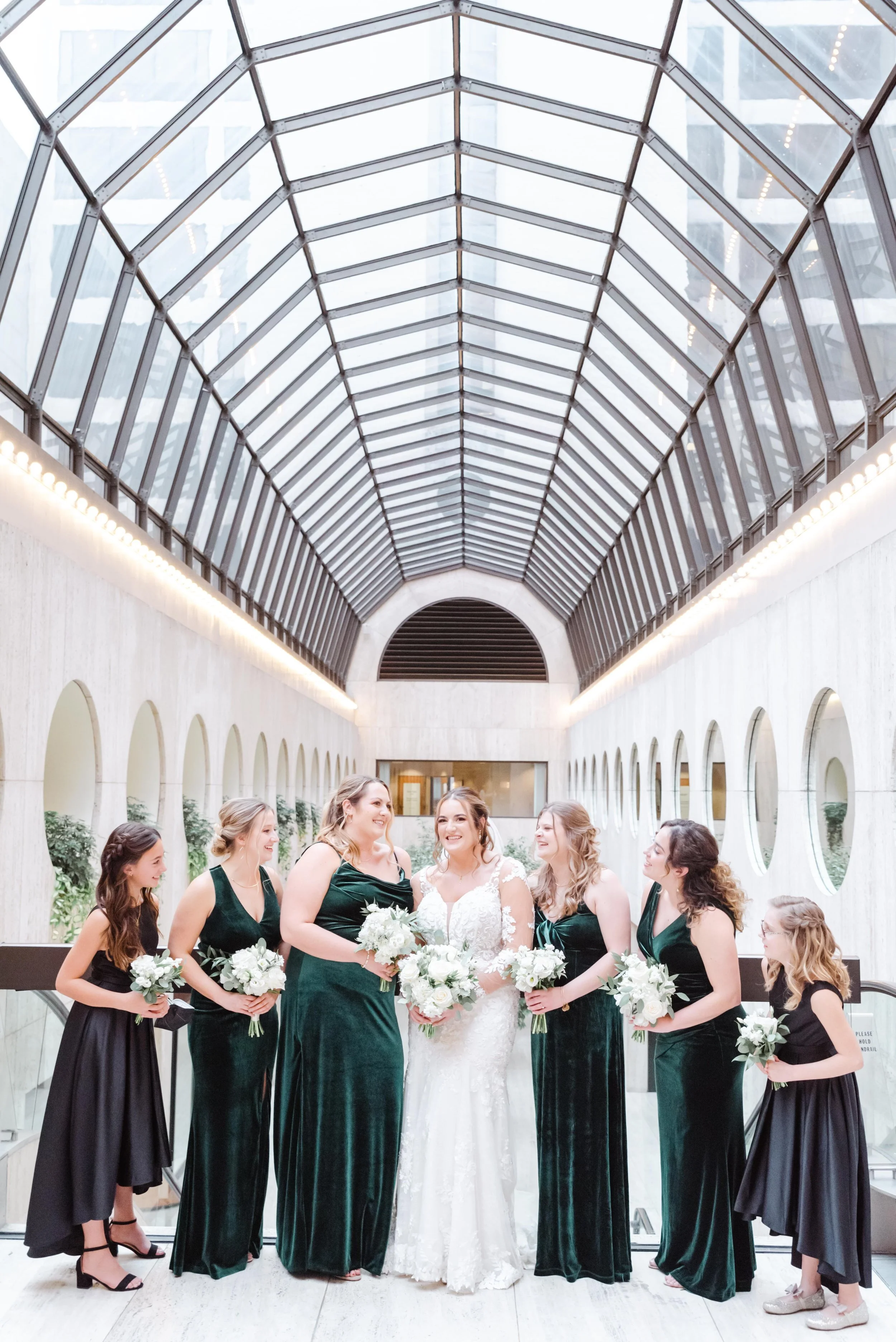 After they were ready, we headed down to their wedding venue- The Center, to have a first look between the bride & groom. We were lucky to experience extremely warm temperatures for a winter wedding, so we then walked around downtown Cincinnati, stopping at some of my favorite spots for photos along the way. The best place to take wedding party photos in downtown Cincinnati is at P & G Park. Although there were lots of other wedding parties with he same idea, the park is quite large and we didn’t have a hard time finding a great location.