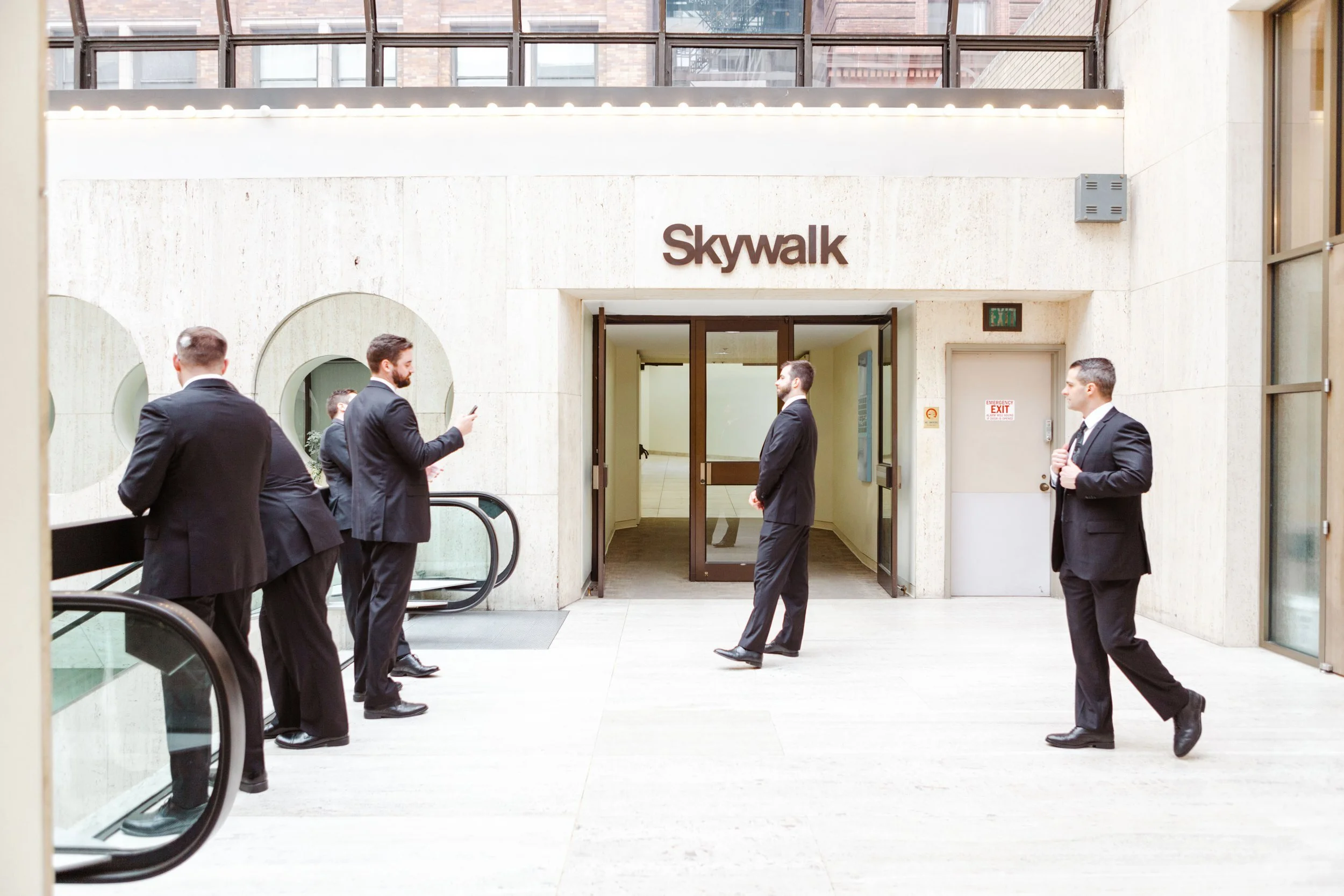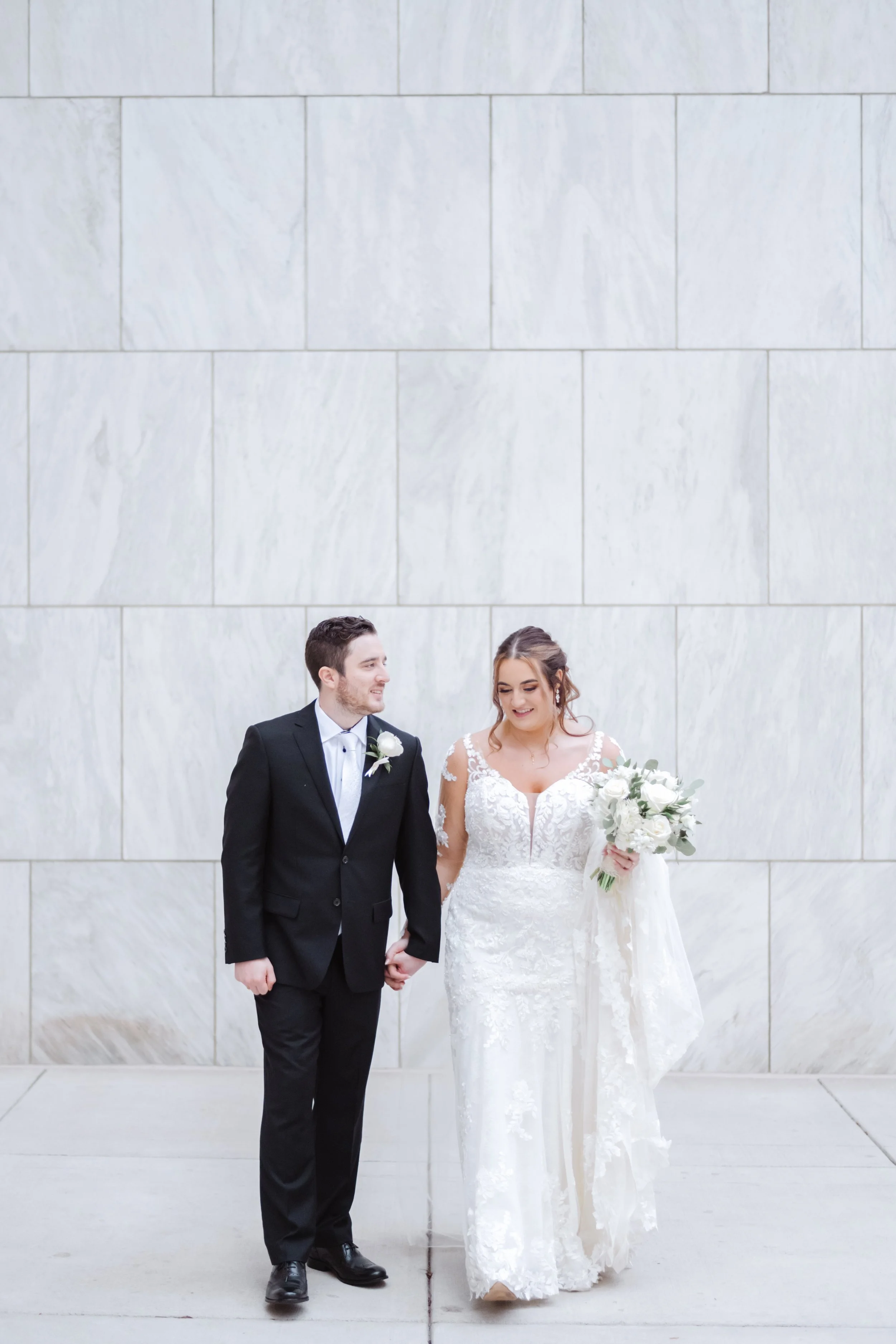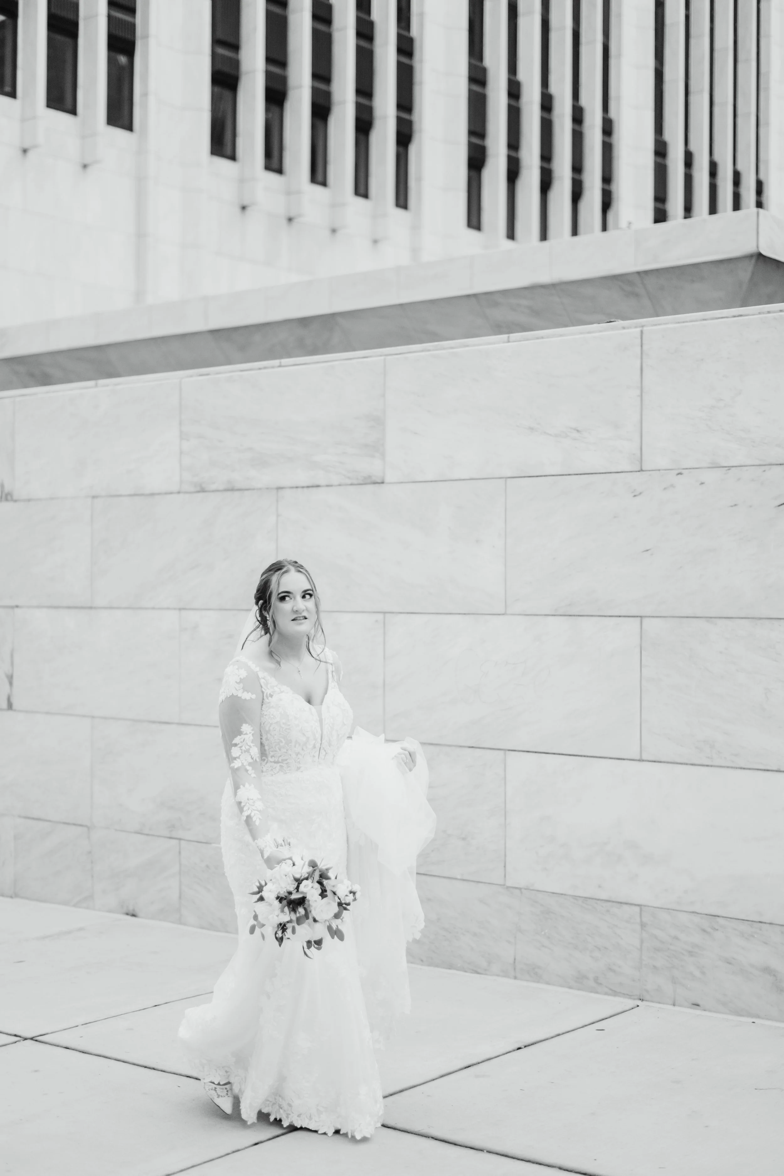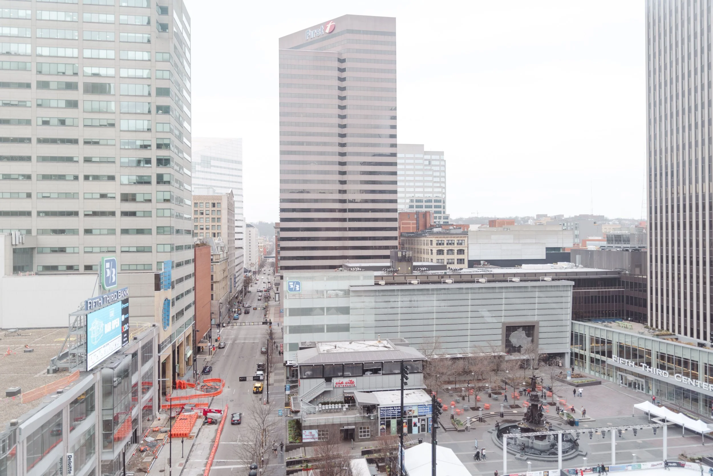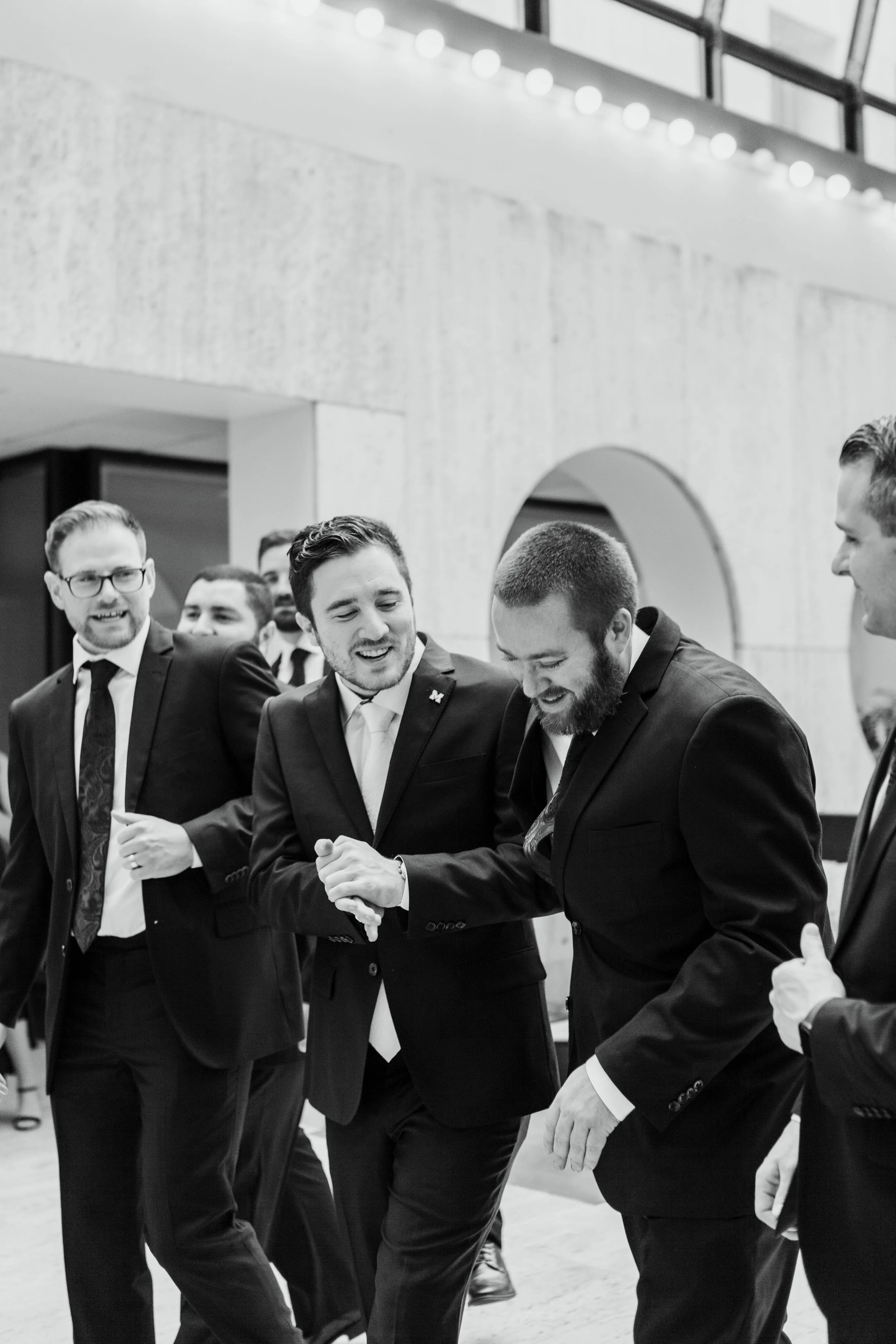 After they were ready, we headed down to their wedding venue- The Center, to have a first look between the bride & groom. We were lucky to experience extremely warm temperatures for a winter wedding, so we then walked around downtown Cincinnati, stopping at some of my favorite spots for photos along the way. The best place to take wedding party photos in downtown Cincinnati is at P & G Park. Although there were lots of other wedding parties with he same idea, the park is quite large and we didn’t have a hard time finding a great location.