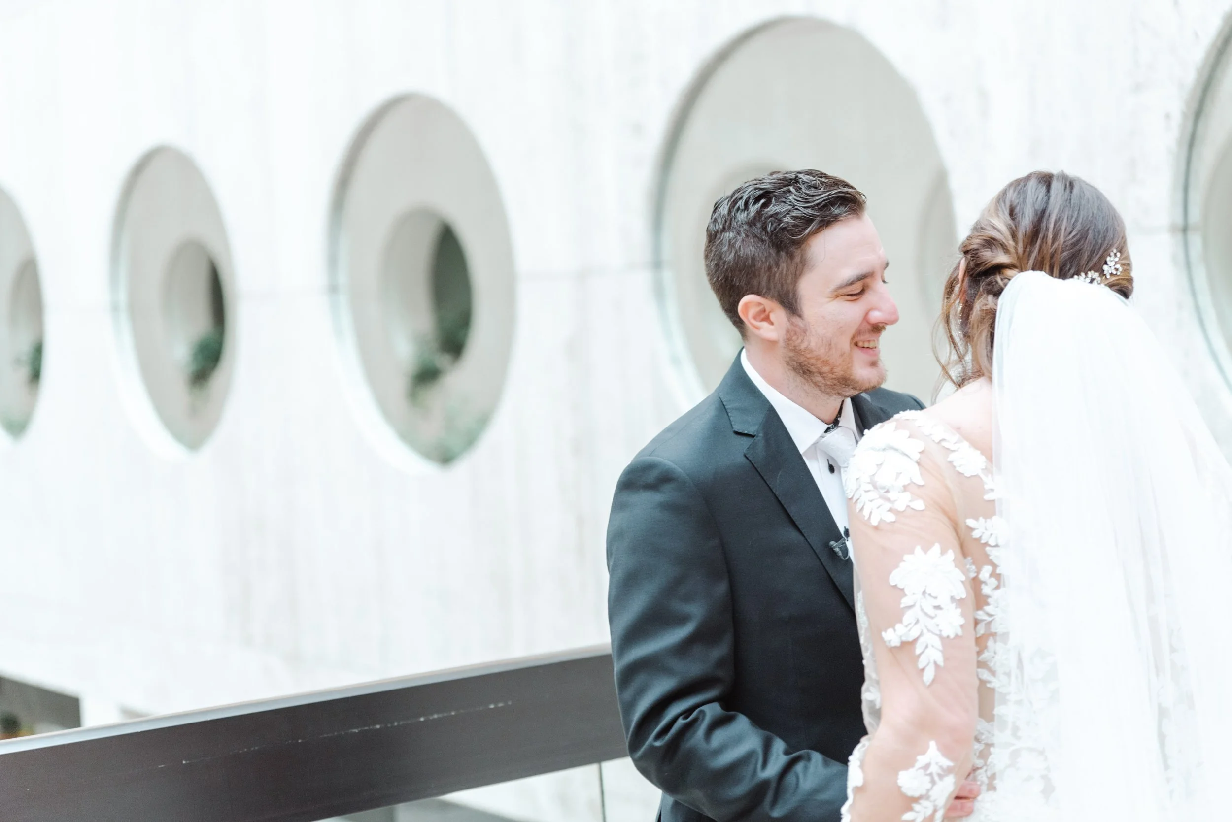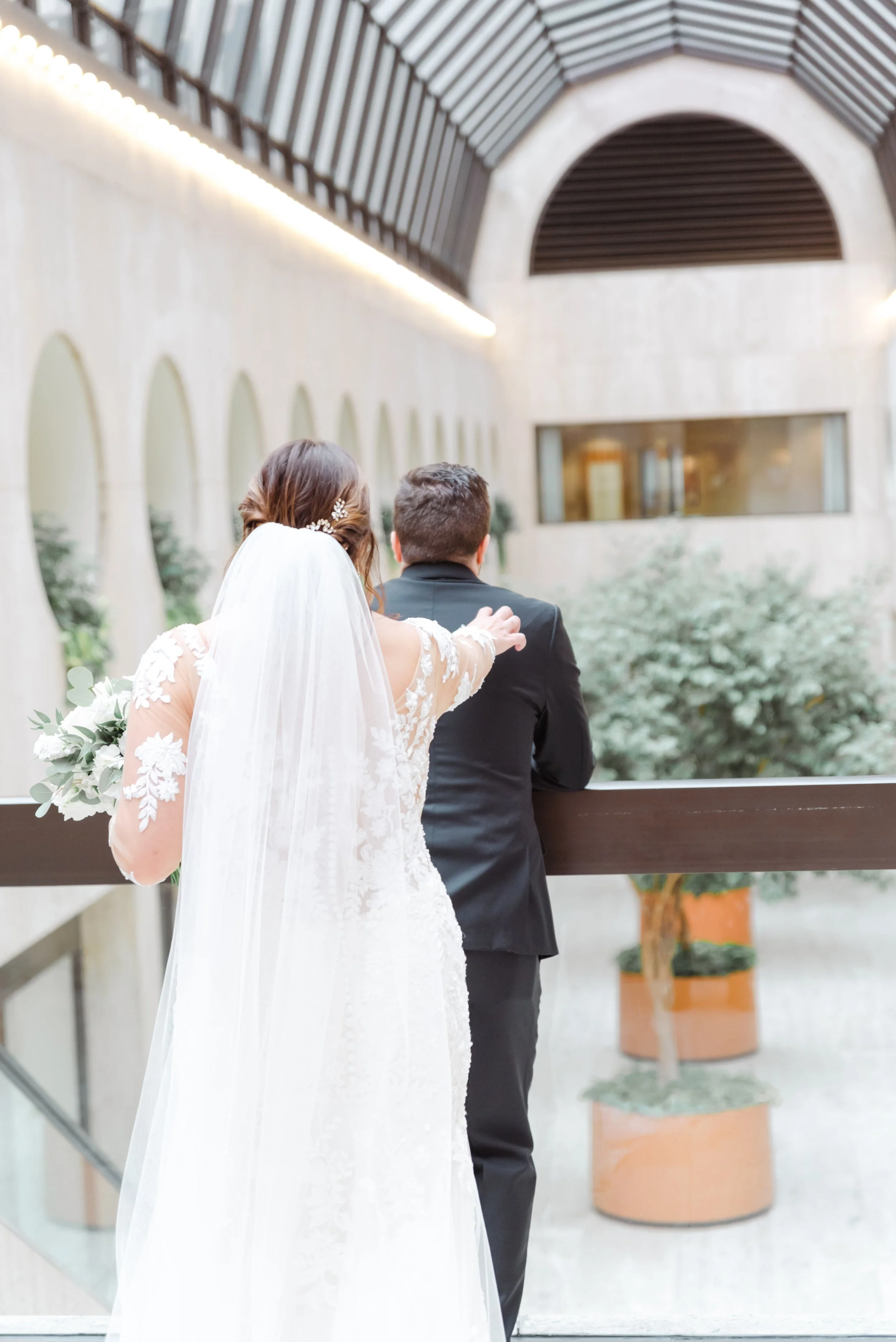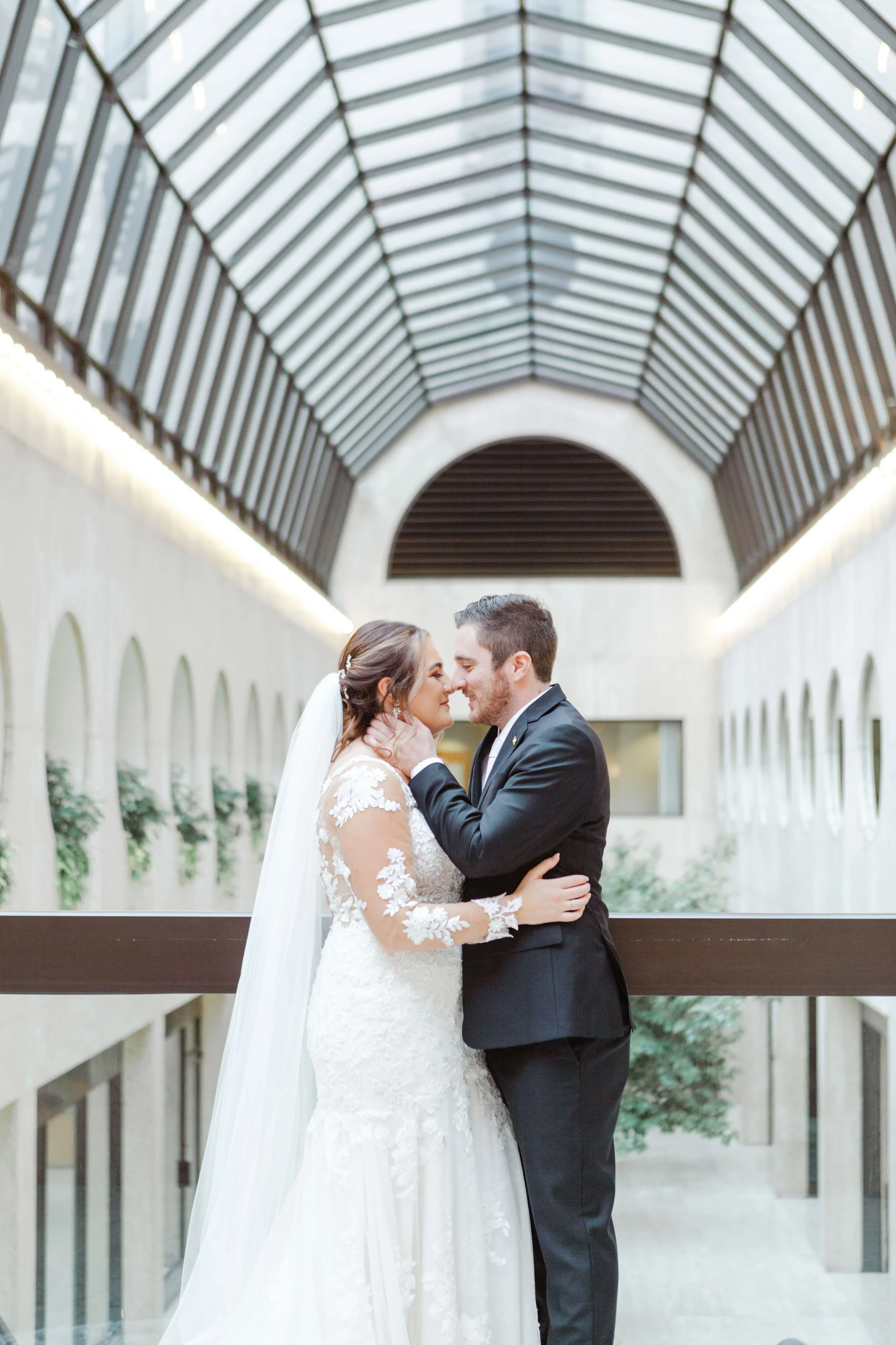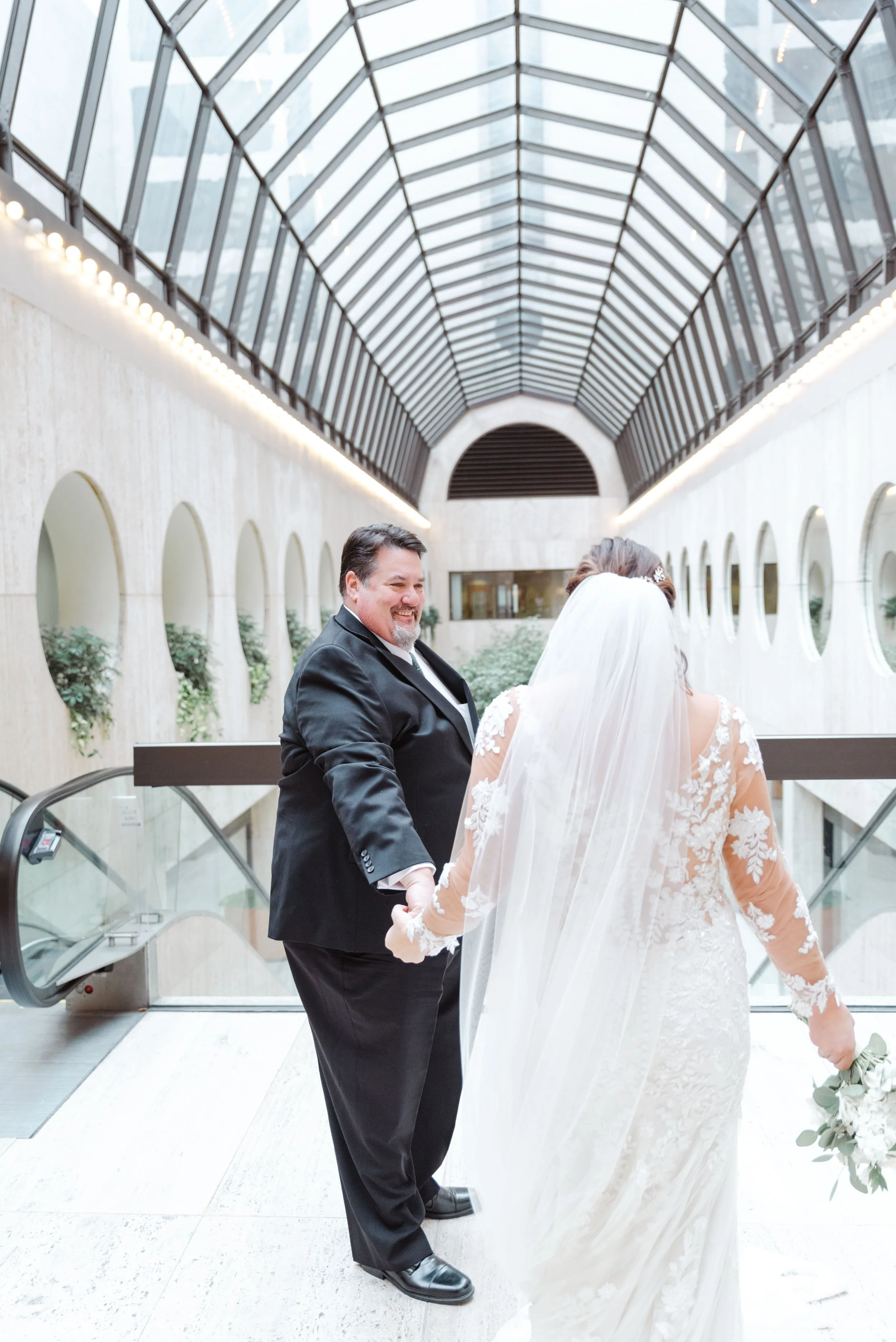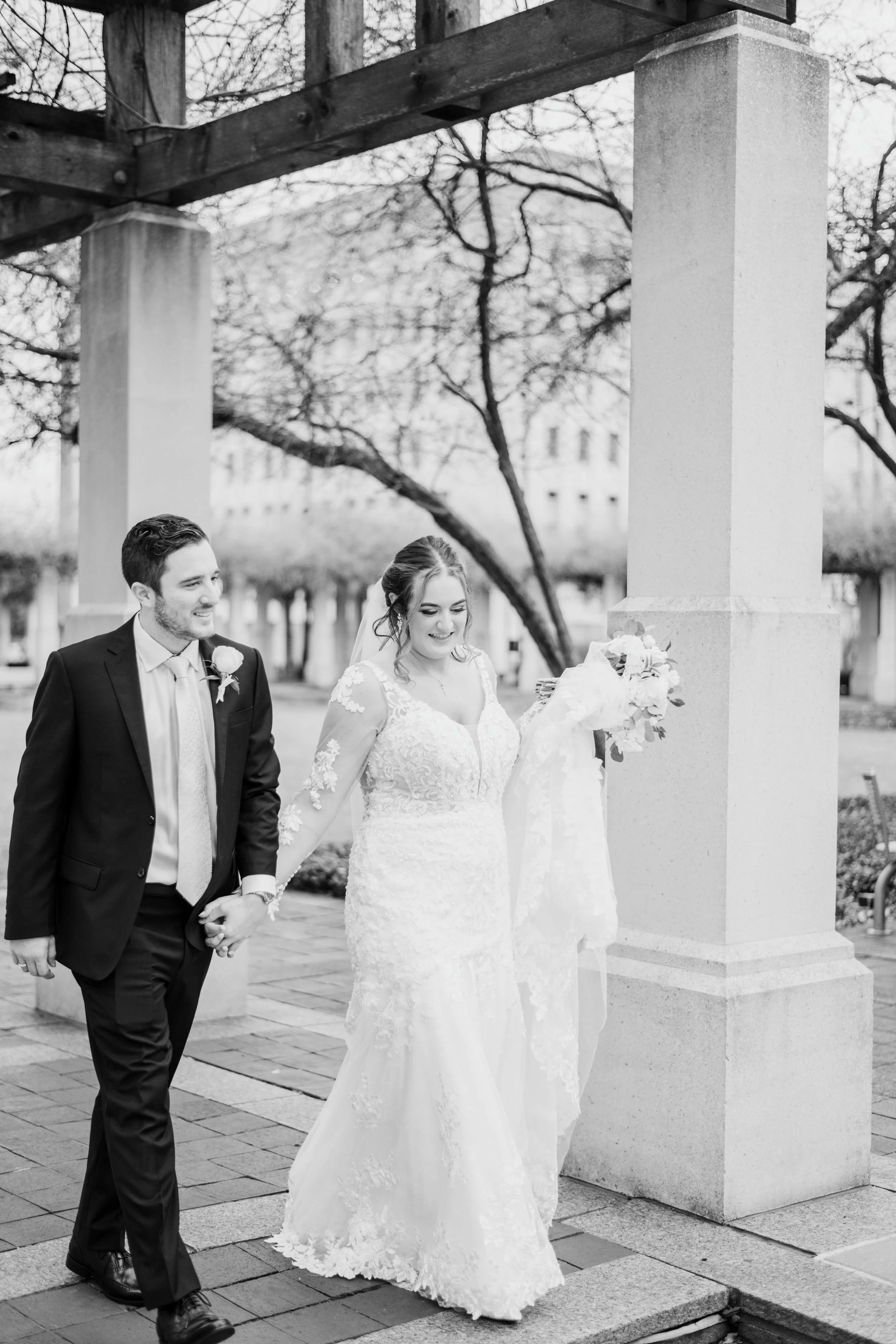 After they were ready, we headed down to their wedding venue- The Center, to have a first look between the bride & groom. We were lucky to experience extremely warm temperatures for a winter wedding, so we then walked around downtown Cincinnati, stopping at some of my favorite spots for photos along the way. The best place to take wedding party photos in downtown Cincinnati is at P & G Park. Although there were lots of other wedding parties with he same idea, the park is quite large and we didn’t have a hard time finding a great location.