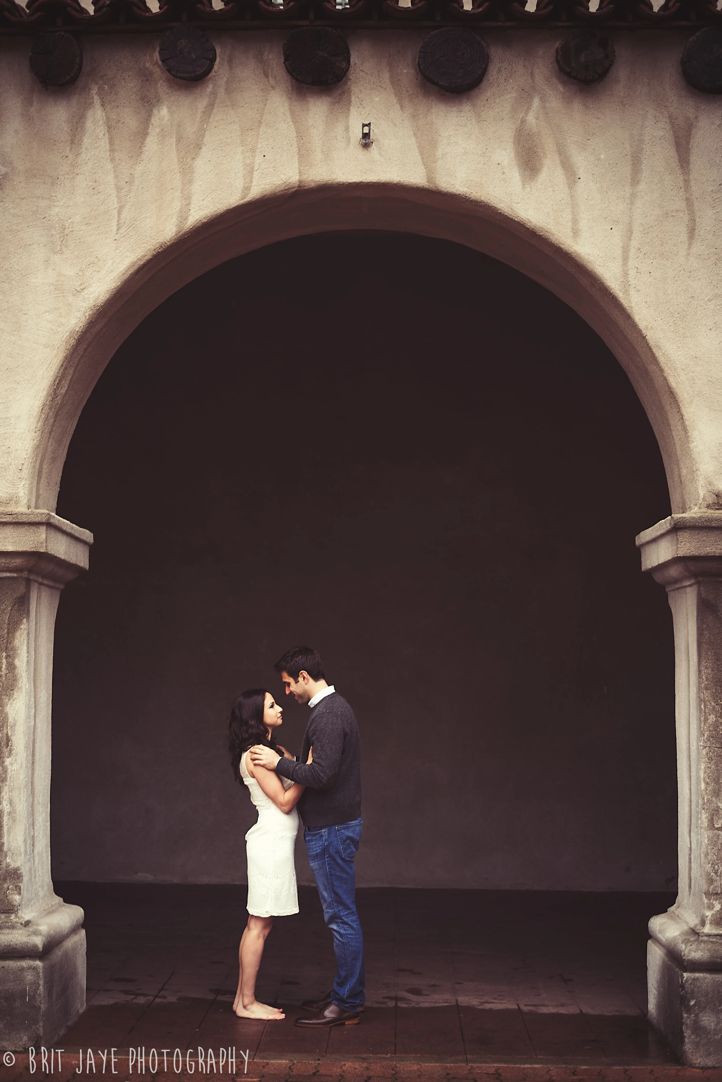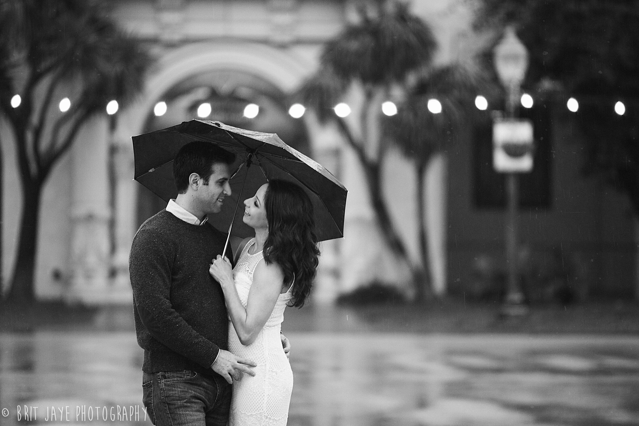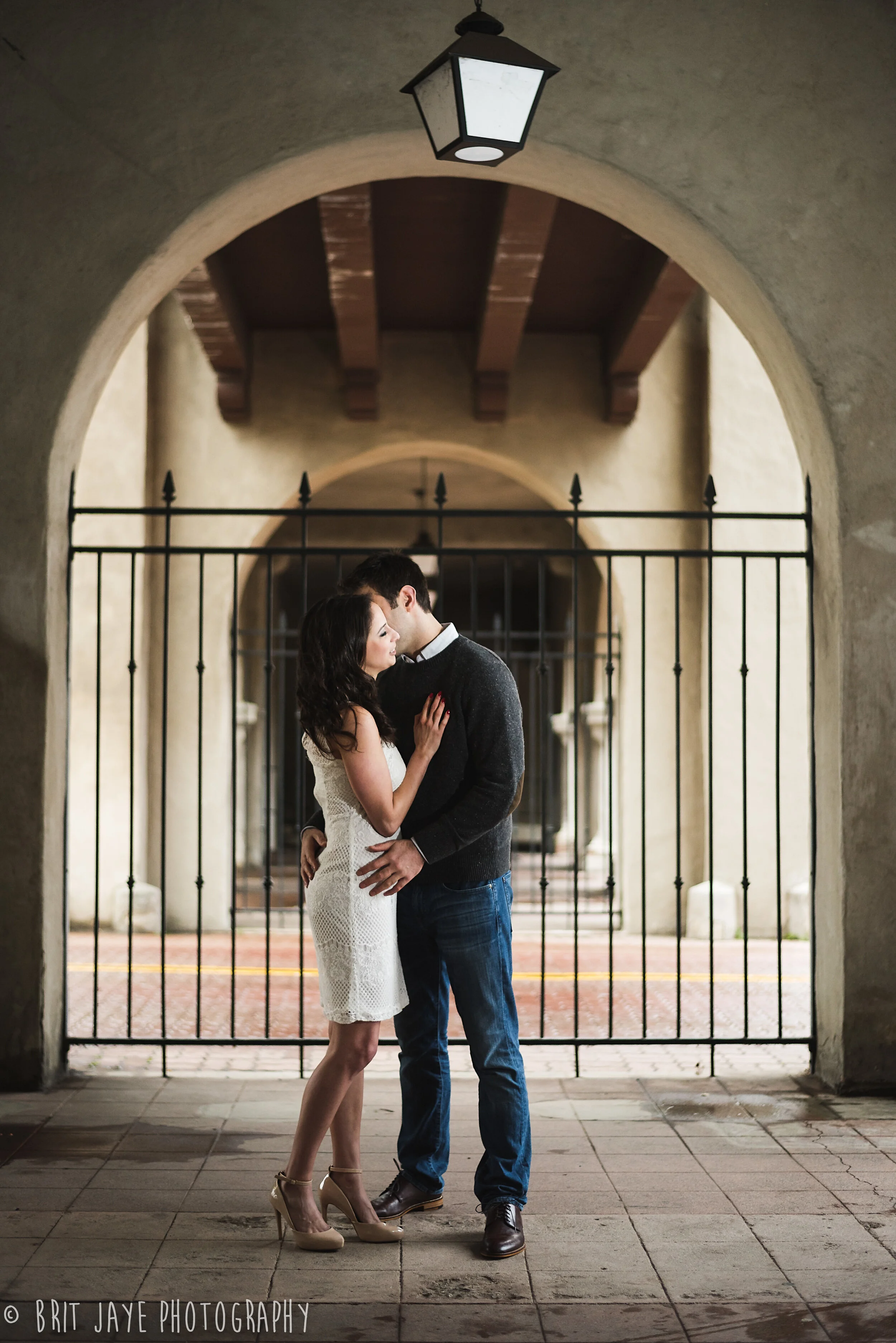 There is something so romantic about the rain- the way it makes you want to cuddle up to stay warm. That combined with the historic Spanish-style architecture made this the perfect location for a romantic engagement session. I love Balboa Park as an engagement shoot location anyway, but the rain was a fun new element to work with! Puddles are a bit of a rarity, here in San Diego.
