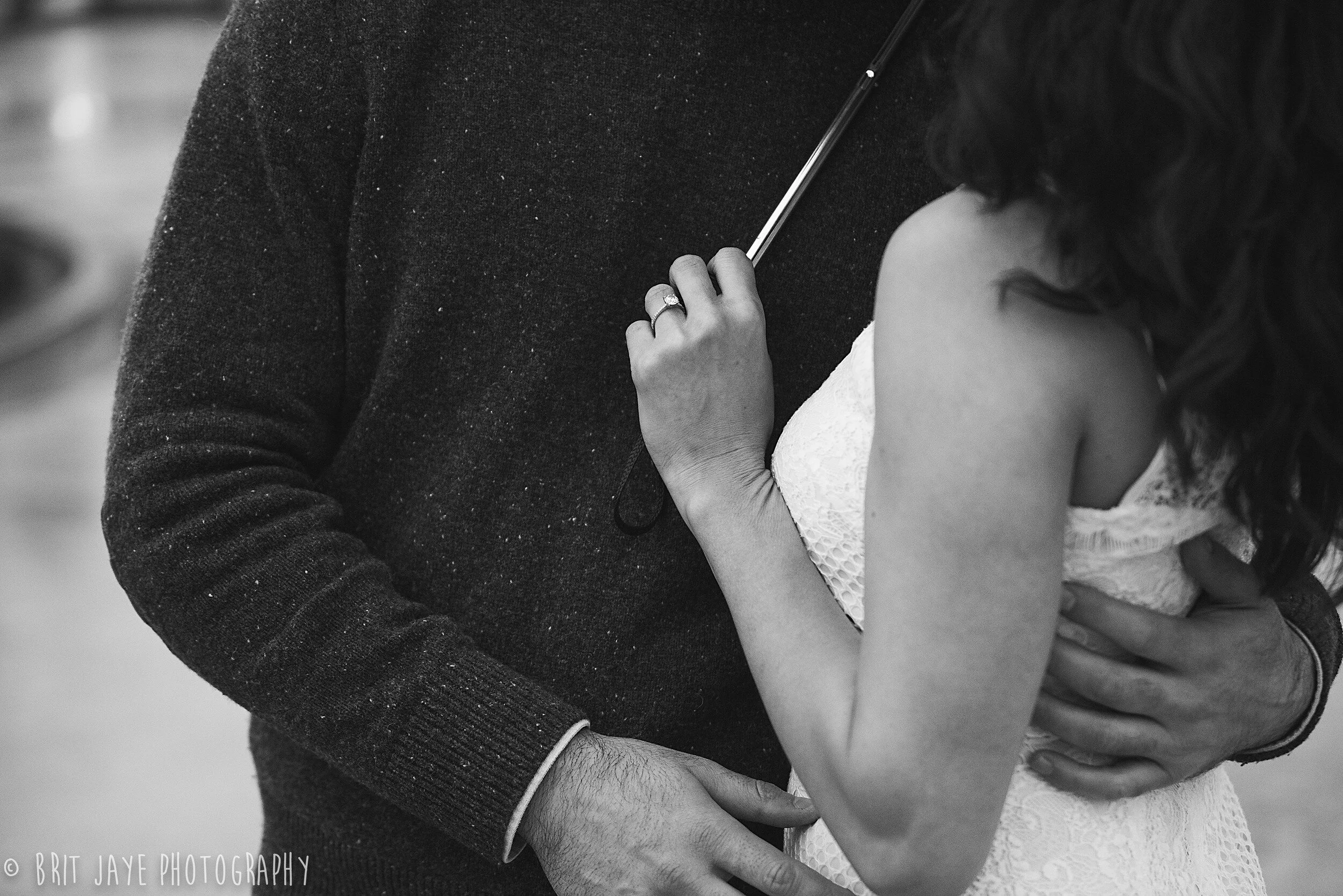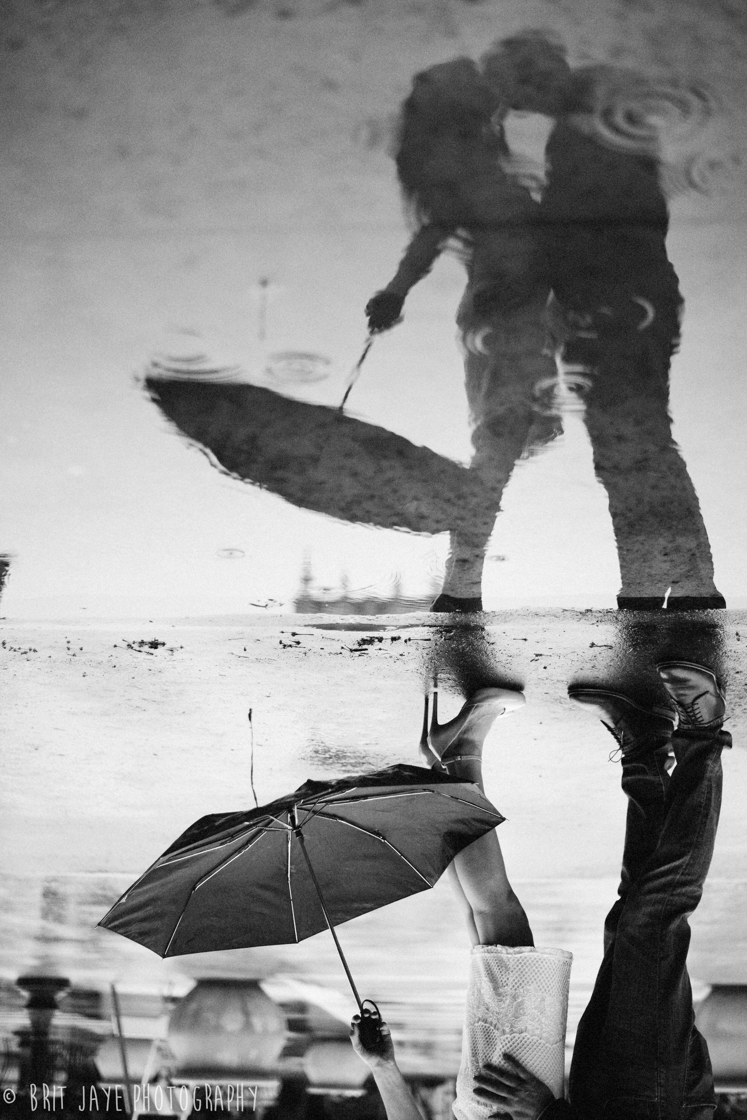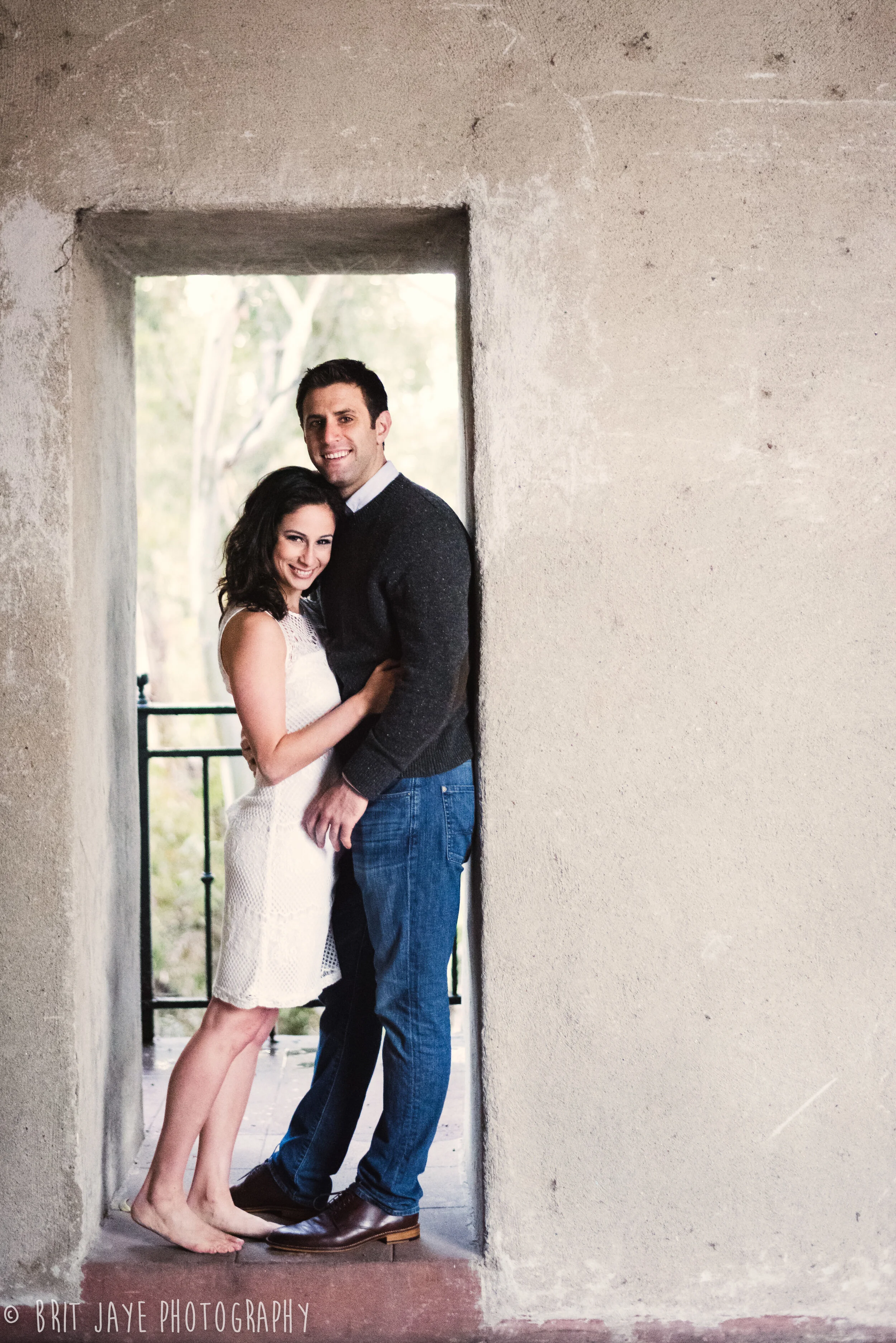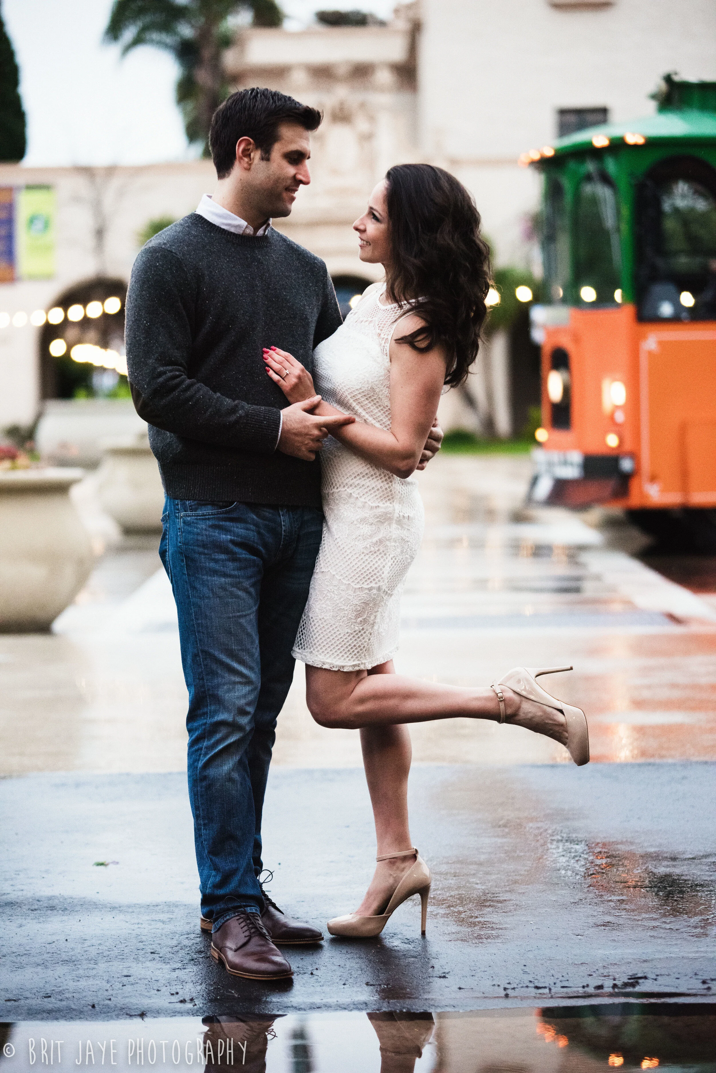 There is something so romantic about the rain- the way it makes you want to cuddle up to stay warm. That combined with the historic Spanish-style architecture made this the perfect location for a romantic engagement session. I love Balboa Park as an engagement shoot location anyway, but the rain was a fun new element to work with! Puddles are a bit of a rarity, here in San Diego.