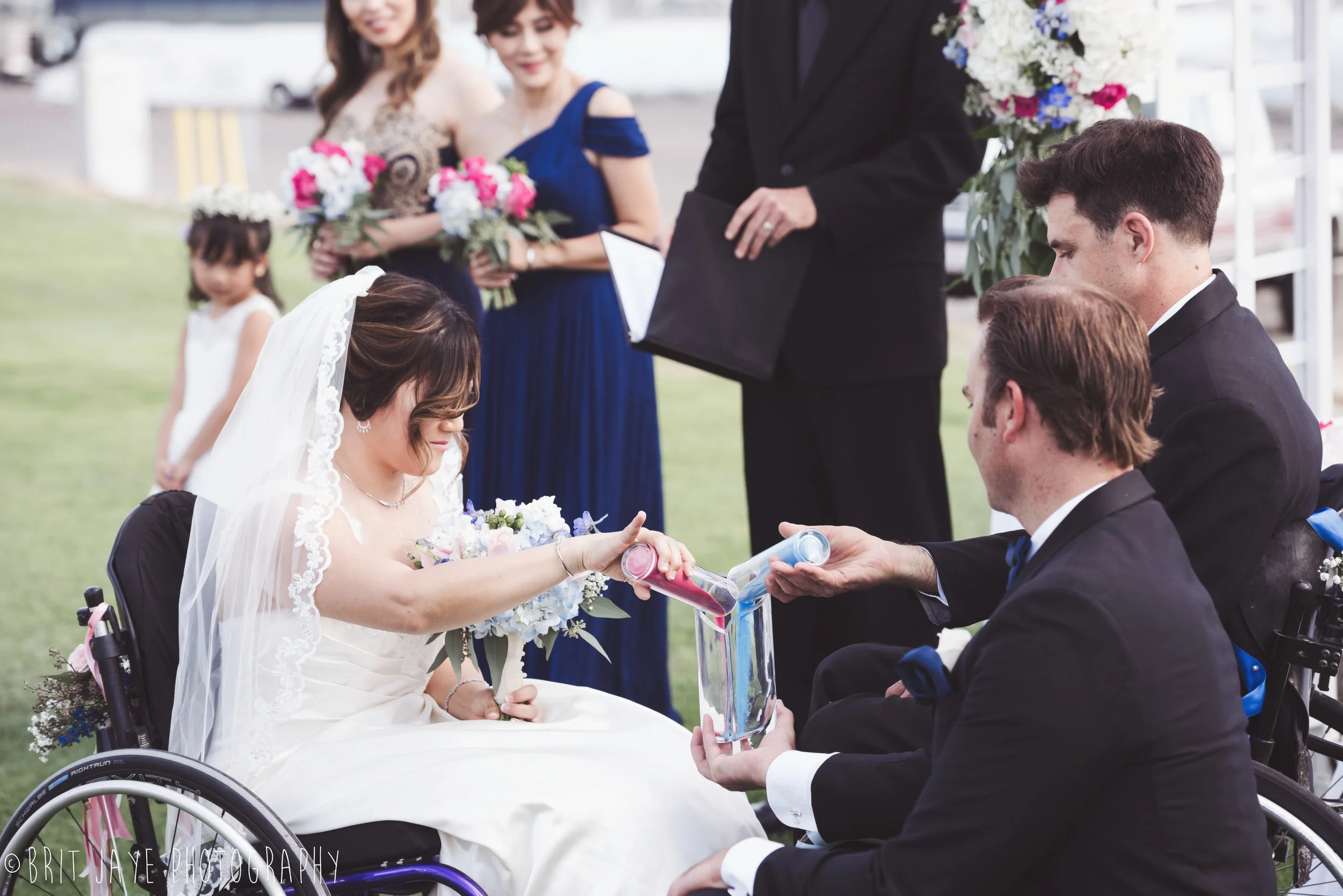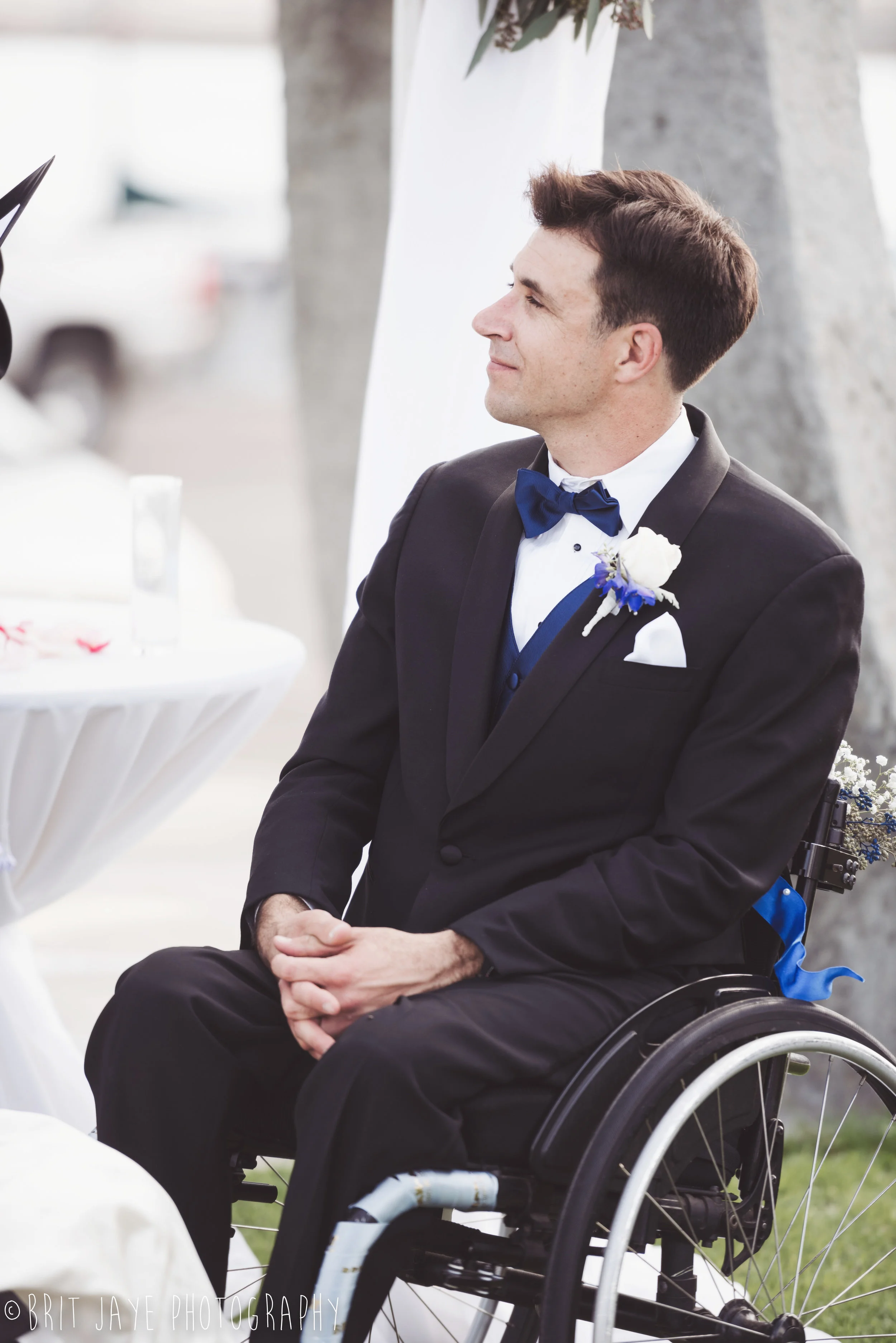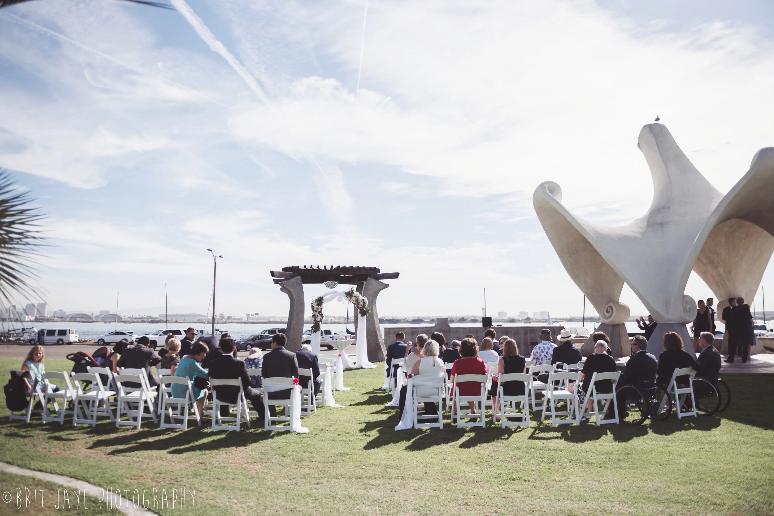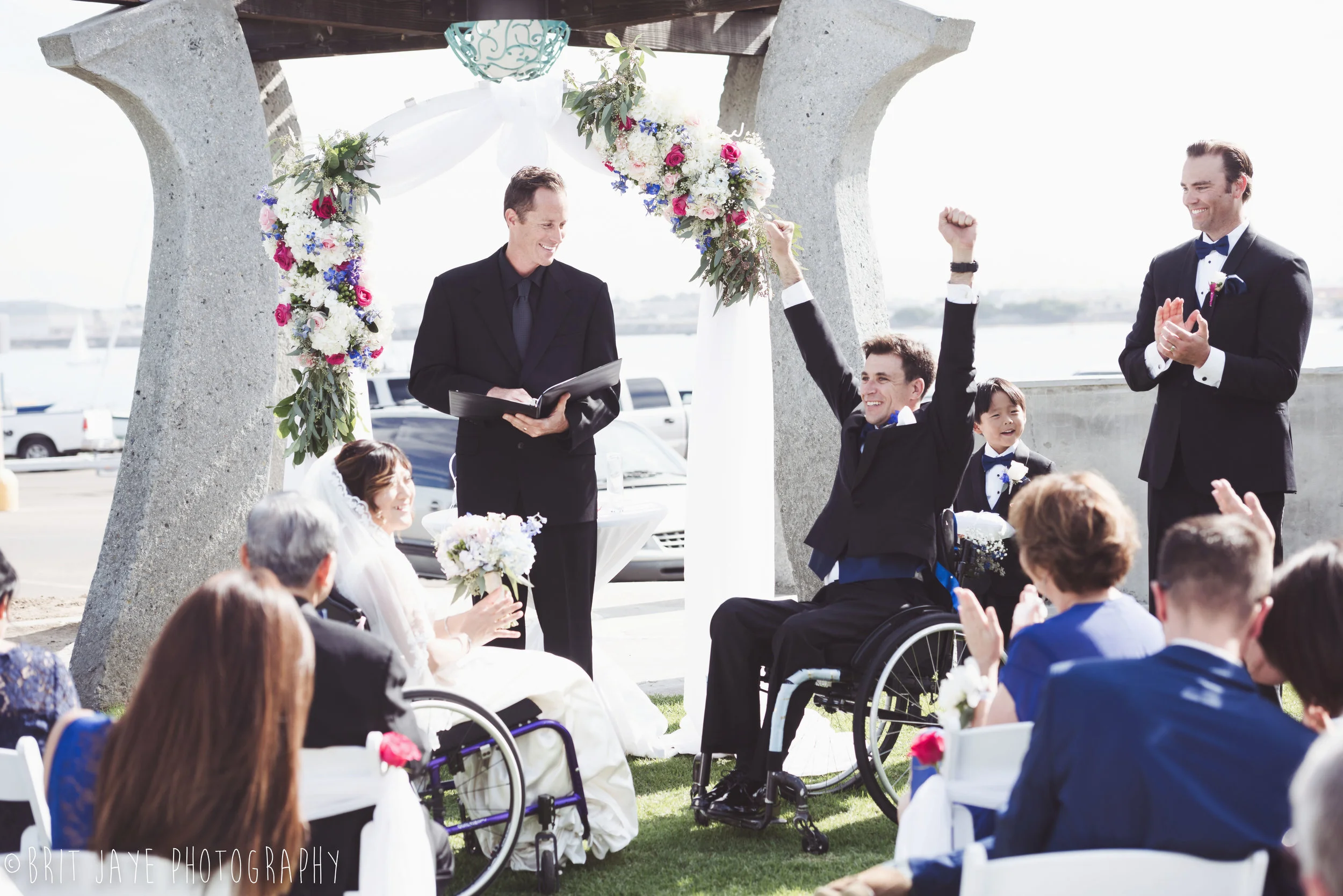 This gorgeous wedding overlooking the San Diego Bay at the Bay Club Hotel was absolutely perfect. The bride & groom hung Mr. & Mrs. signs from the backs of their wheelchairs and it was so adorable, such a wonderful detail. Friends and family enjoyed their outside wedding ceremony there at Shelter Island, with the following reception inside the Bay Club Hotel. Enjoy all the details from this San Diego Bay wedding!