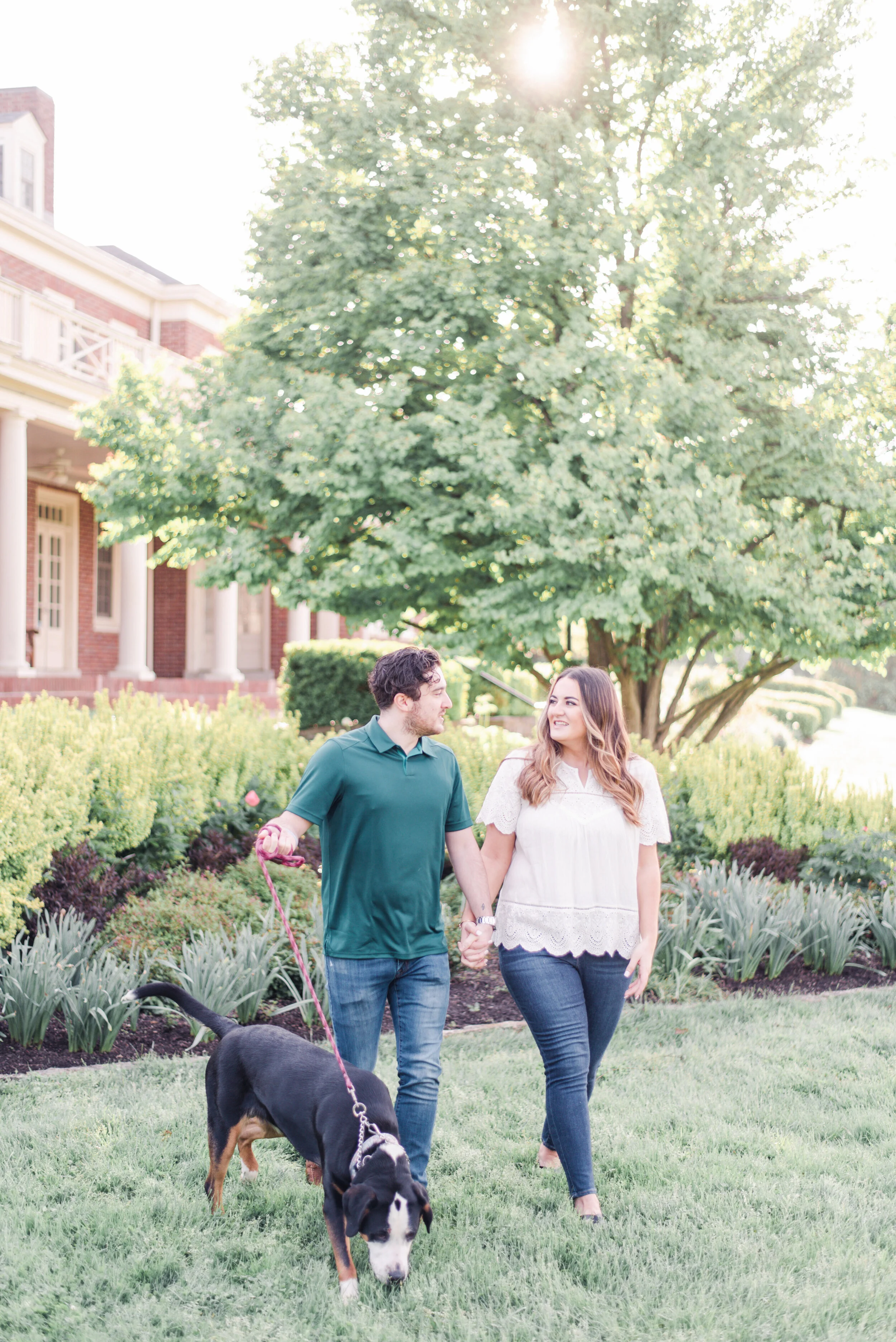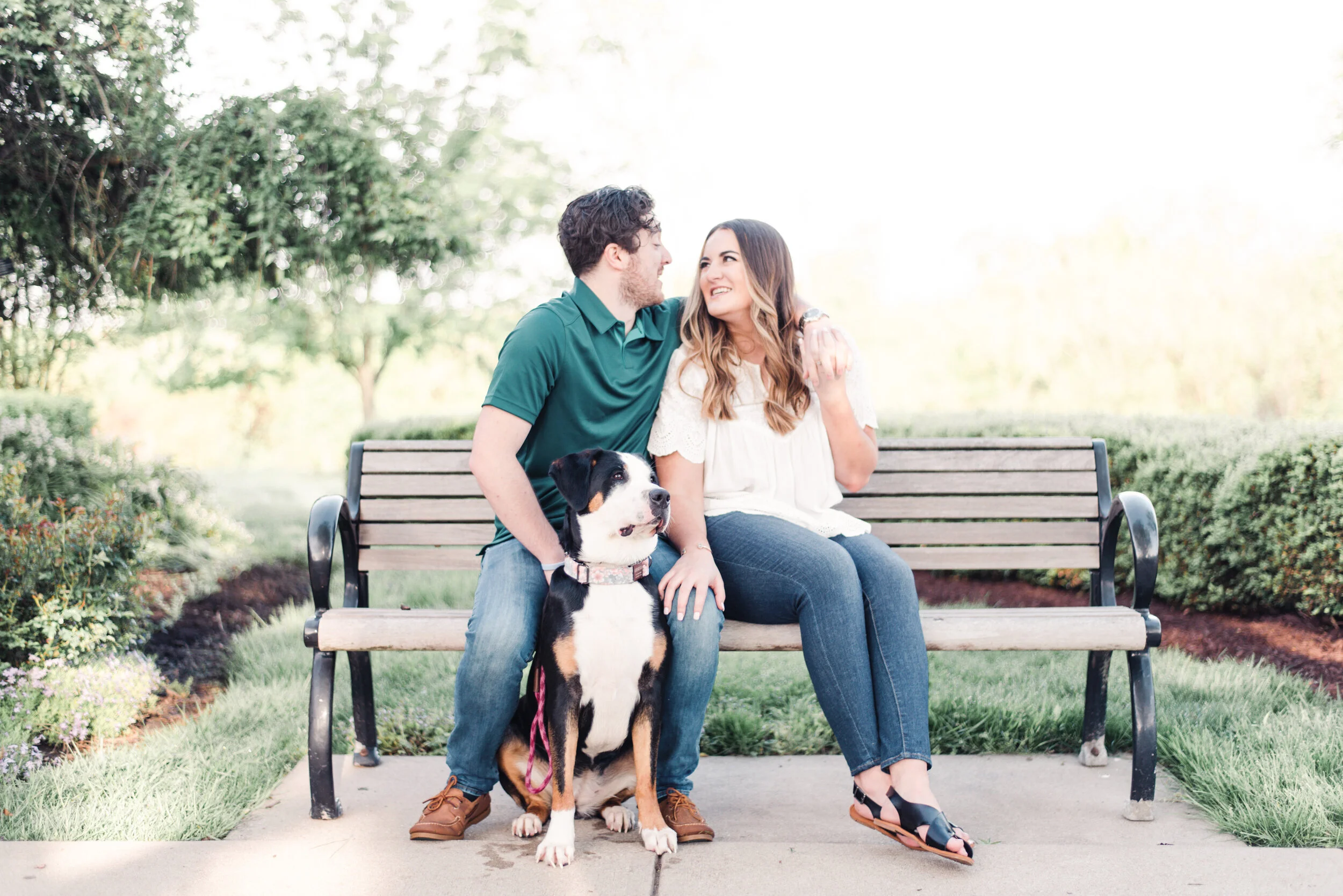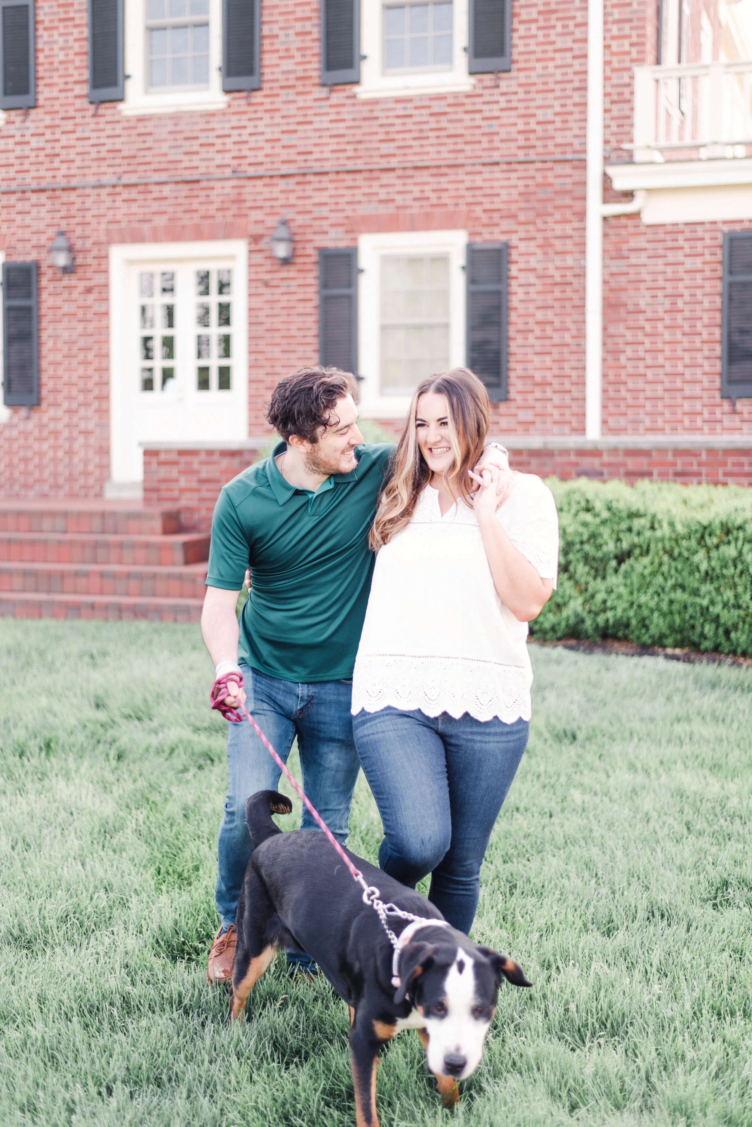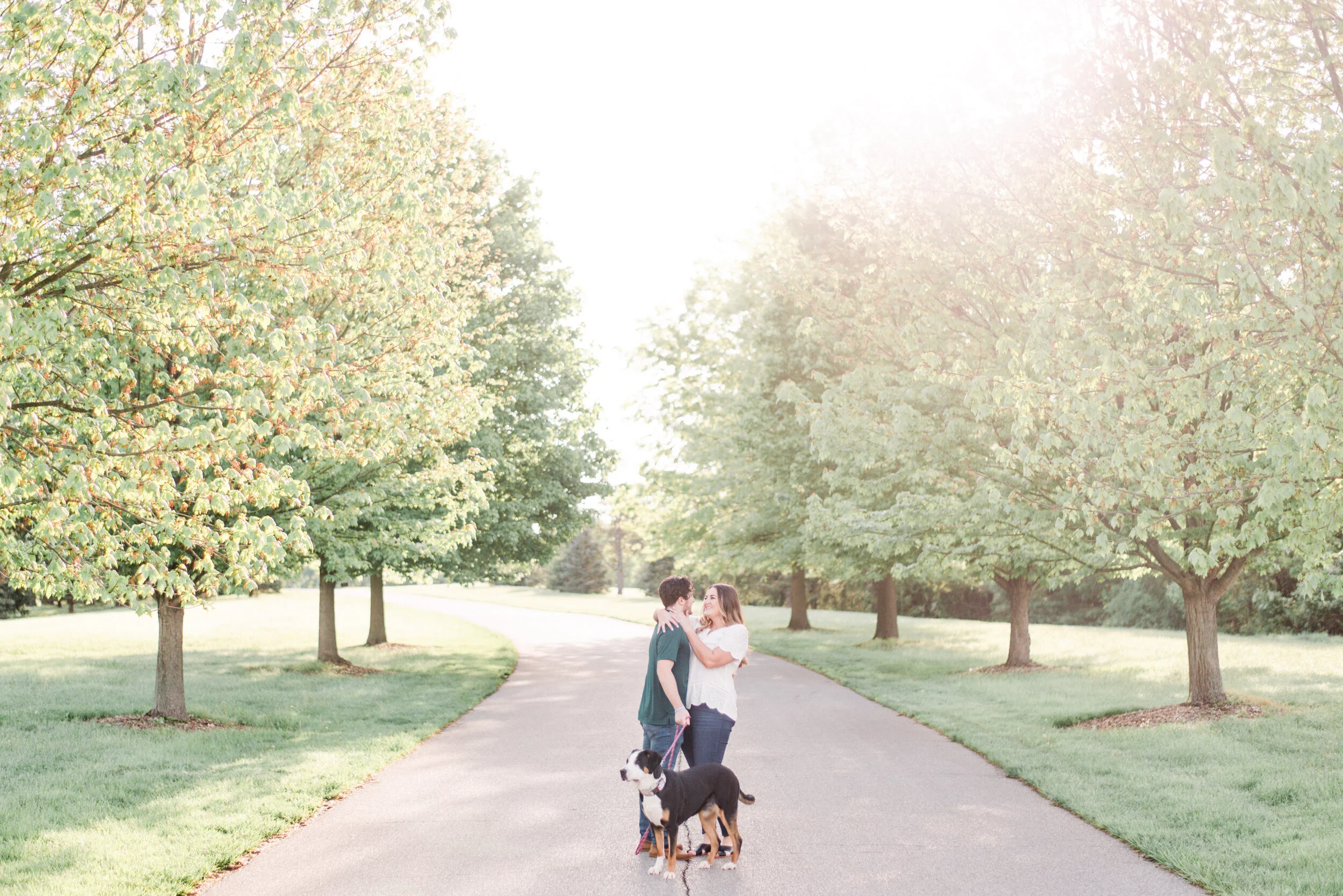This spring engagement session is what dreams are made of. We began our time together at French Park in Cincinnati. K + J brought their dog, Geneva, along to be a part of the beginning of their engagement session. Towards the end of our time at French Park, a friend came by to pick their pup up so they could spend some time getting images of just the two of them. Having a friend ready come help with your dog during your engagement session is so helpful. I wrote a whole post about it, which you can find here. We chose an early morning session time on a weekday to take advantage of the beautiful morning light and also to minimize distractions for the dog. Choosing an early morning session, especially on a weekday, generally means you will have the location all to yourself- which is such a great experience. It totally makes up for having to wake up so early to get ready!