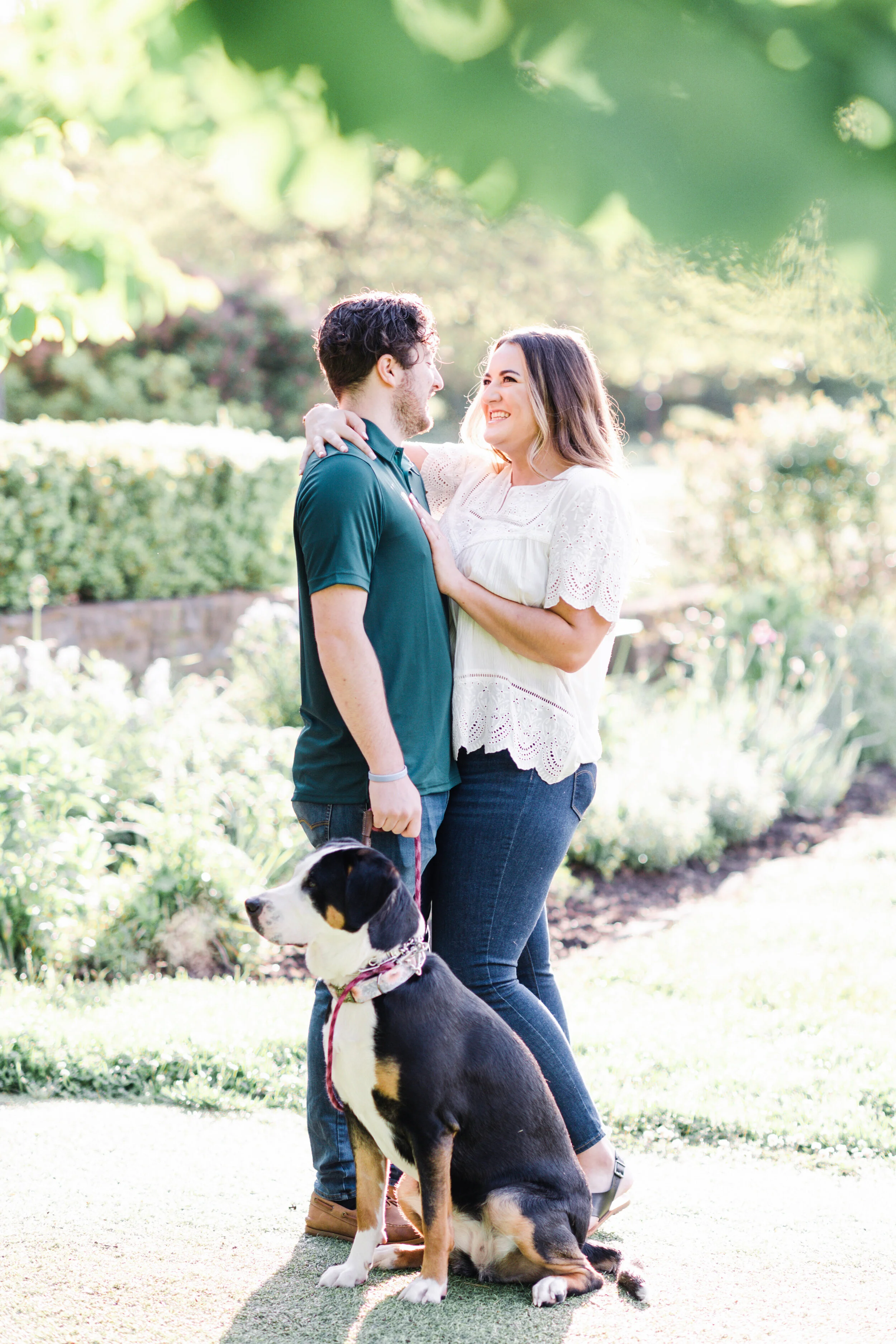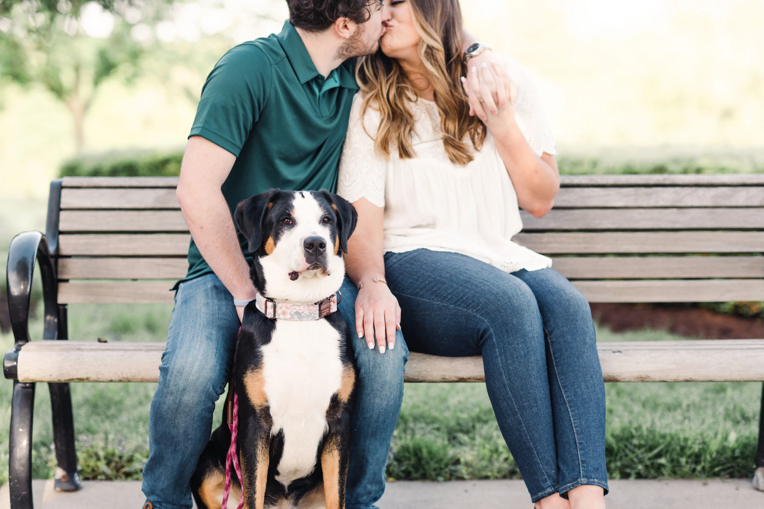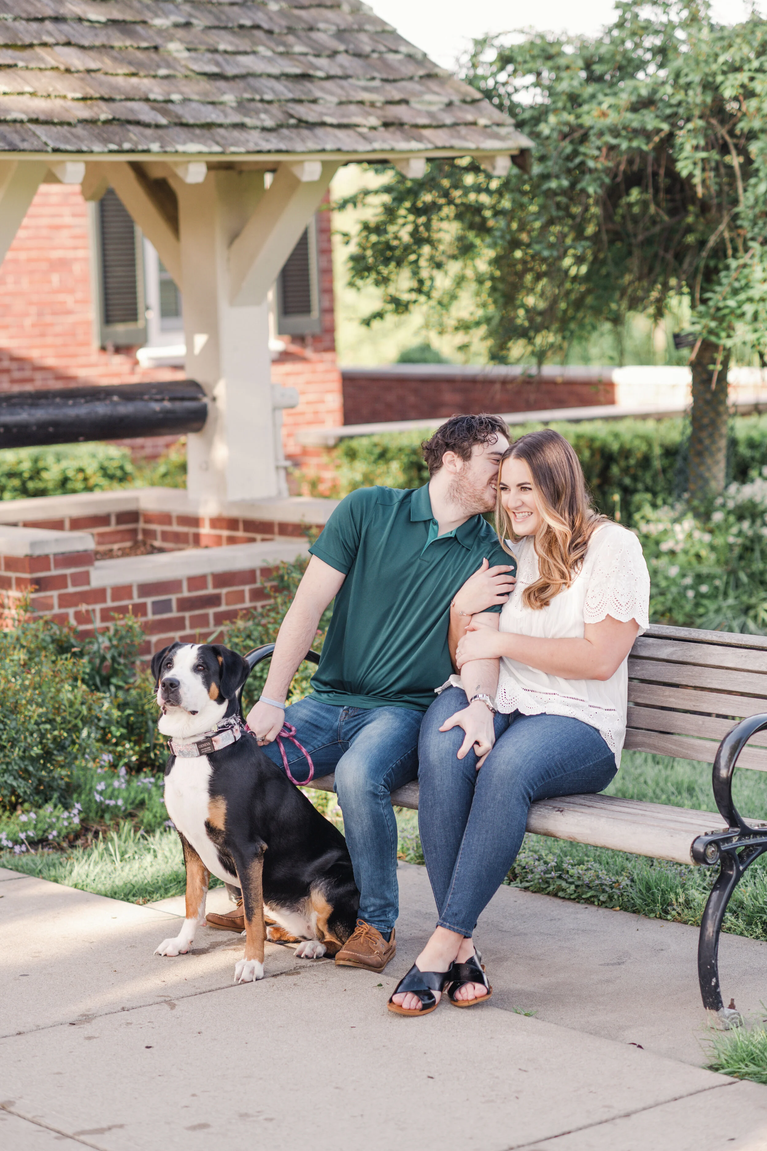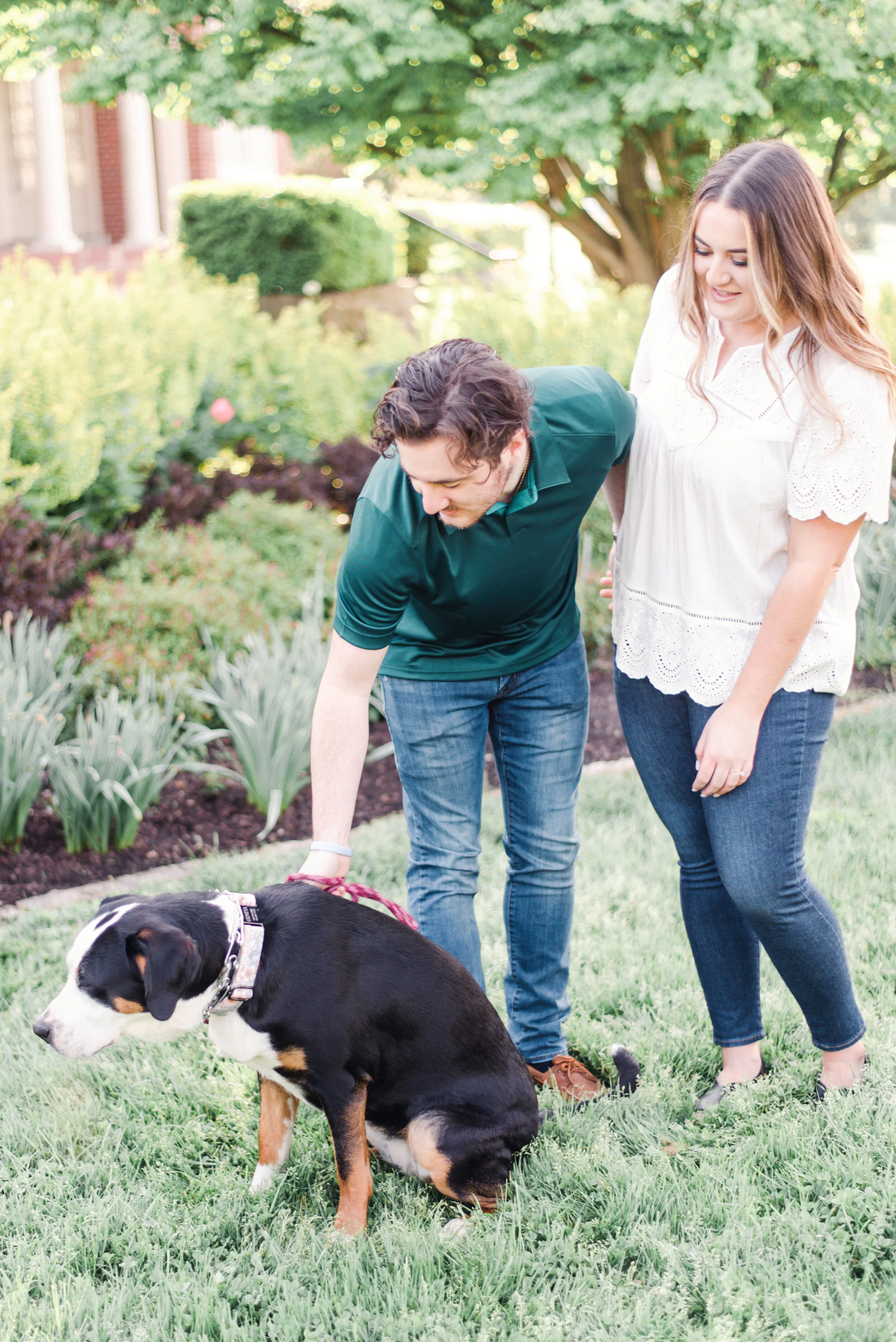 This spring engagement session is what dreams are made of. We began our time together at French Park in Cincinnati. K + J brought their dog, Geneva, along to be a part of the beginning of their engagement session. Towards the end of our time at French Park, a friend came by to pick their pup up so they could spend some time getting images of just the two of them. Having a friend ready come help with your dog during your engagement session is so helpful. I wrote a whole post about it, which you can find here. We chose an early morning session time on a weekday to take advantage of the beautiful morning light and also to minimize distractions for the dog. Choosing an early morning session, especially on a weekday, generally means you will have the location all to yourself- which is such a great experience. It totally makes up for having to wake up so early to get ready!