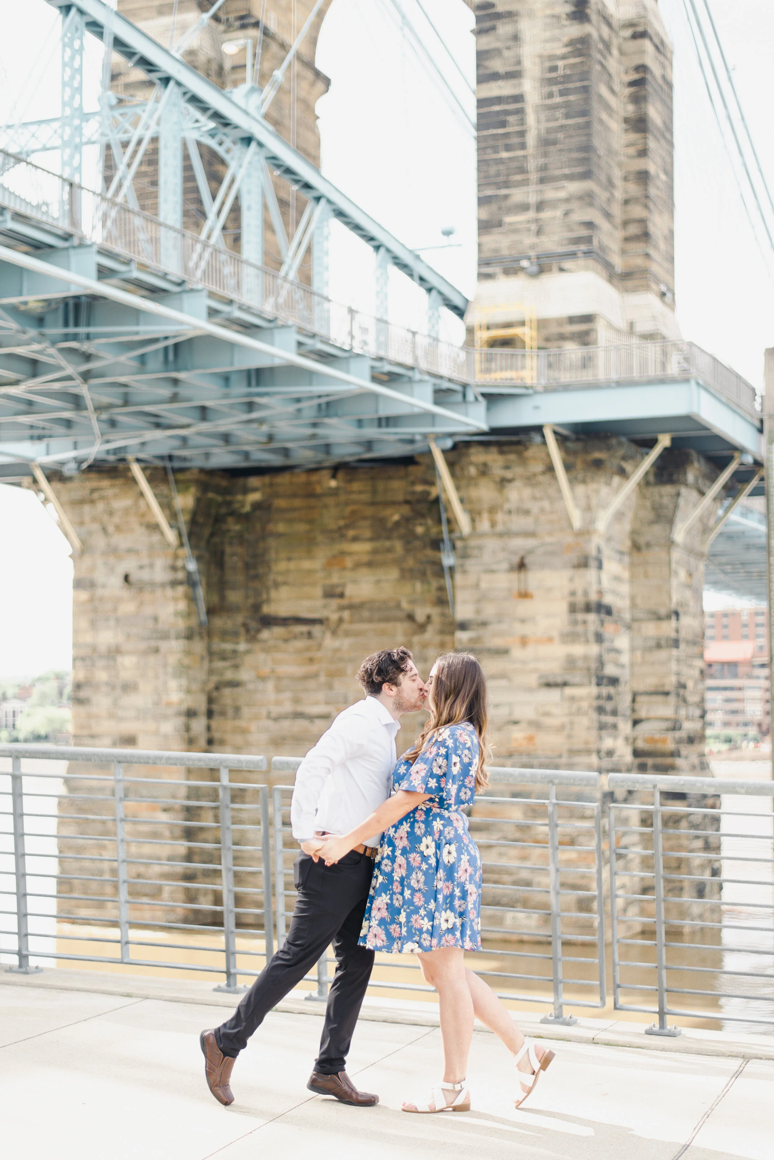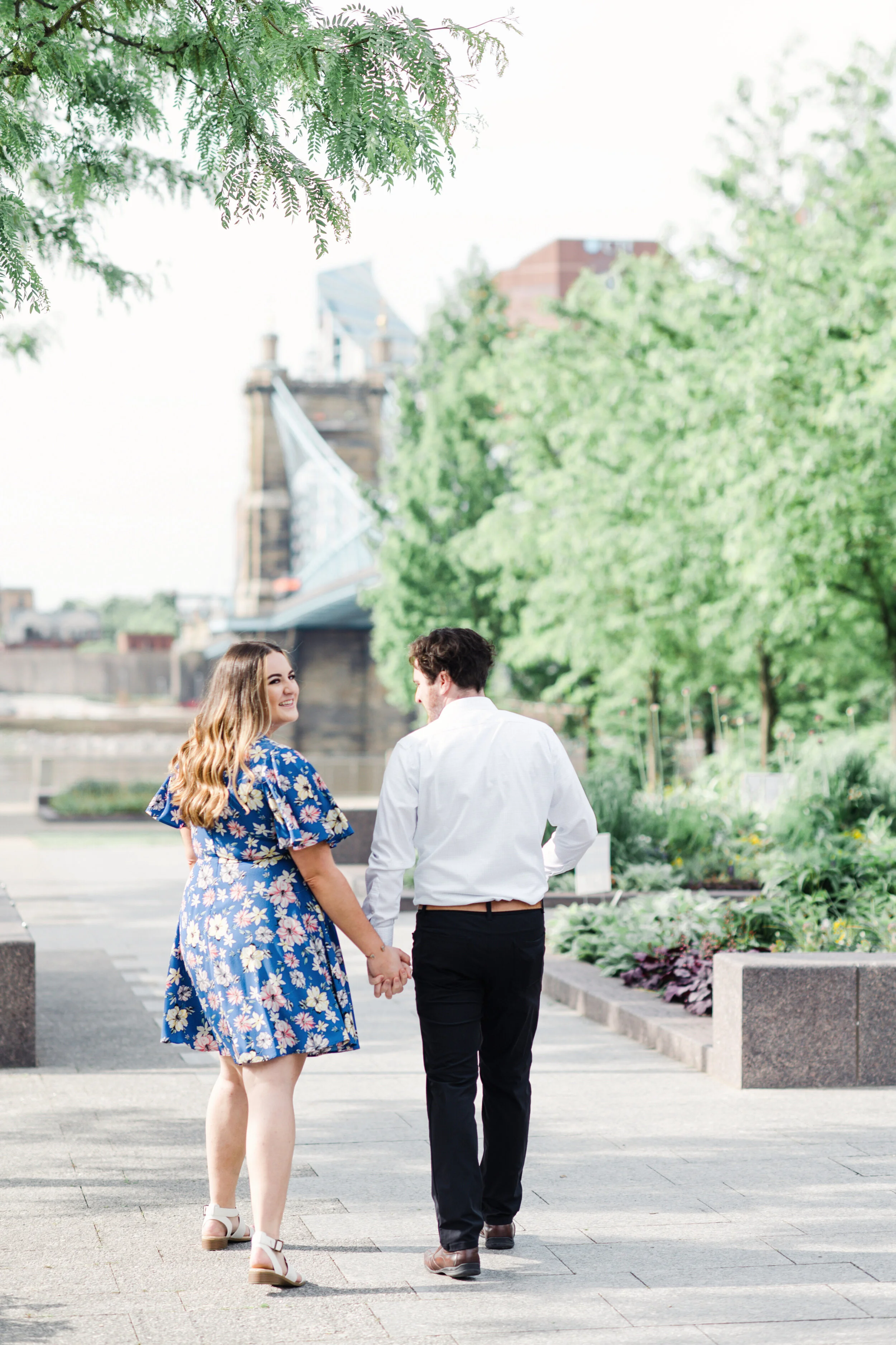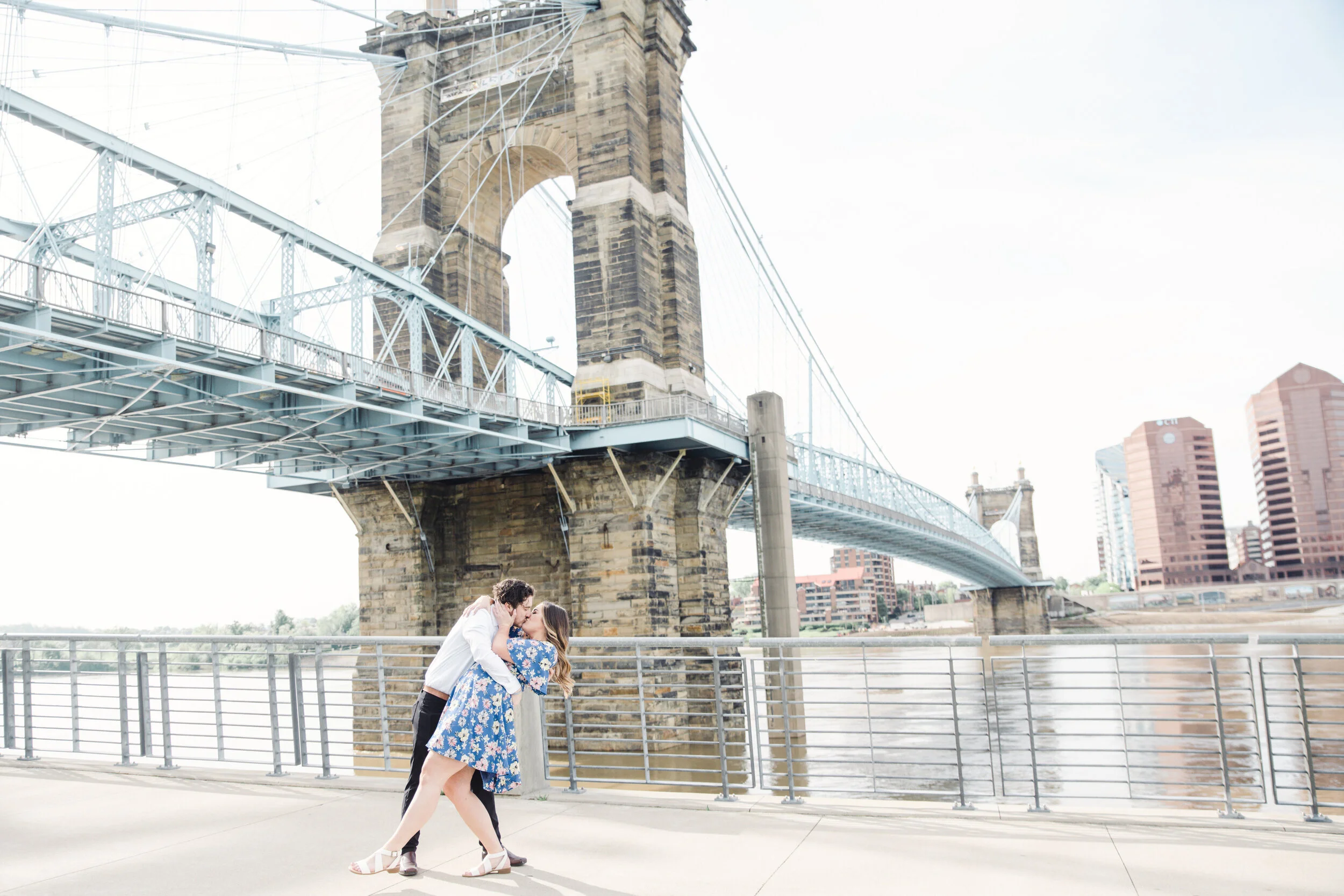 Our second location for their engagement session was Smale Park, which is located right on the riverfront in downtown Cincinnati. Itās a gorgeous park with great views of the Roebling bridge and the Ohio river. This riverfront lark is one of the absolute best locations in Cincinnati for engagement photos. It has a huge variety in one small area. The bridge was u fee construction and access was blocked off when we were there, but usually you could also take advantage of that spot and get photos actually on the bridge as well. Enjoy this gorgeous Cincinnati engagement session! I am so excited to photograph K & J on their wedding day later this year!