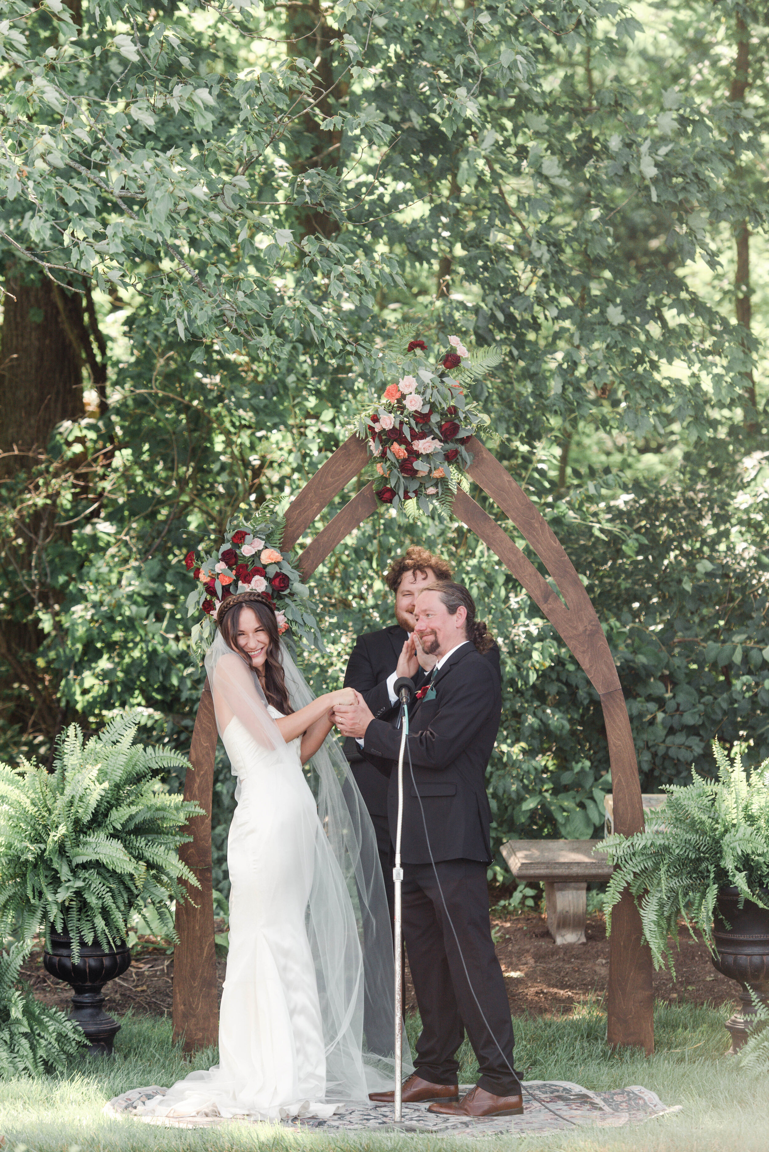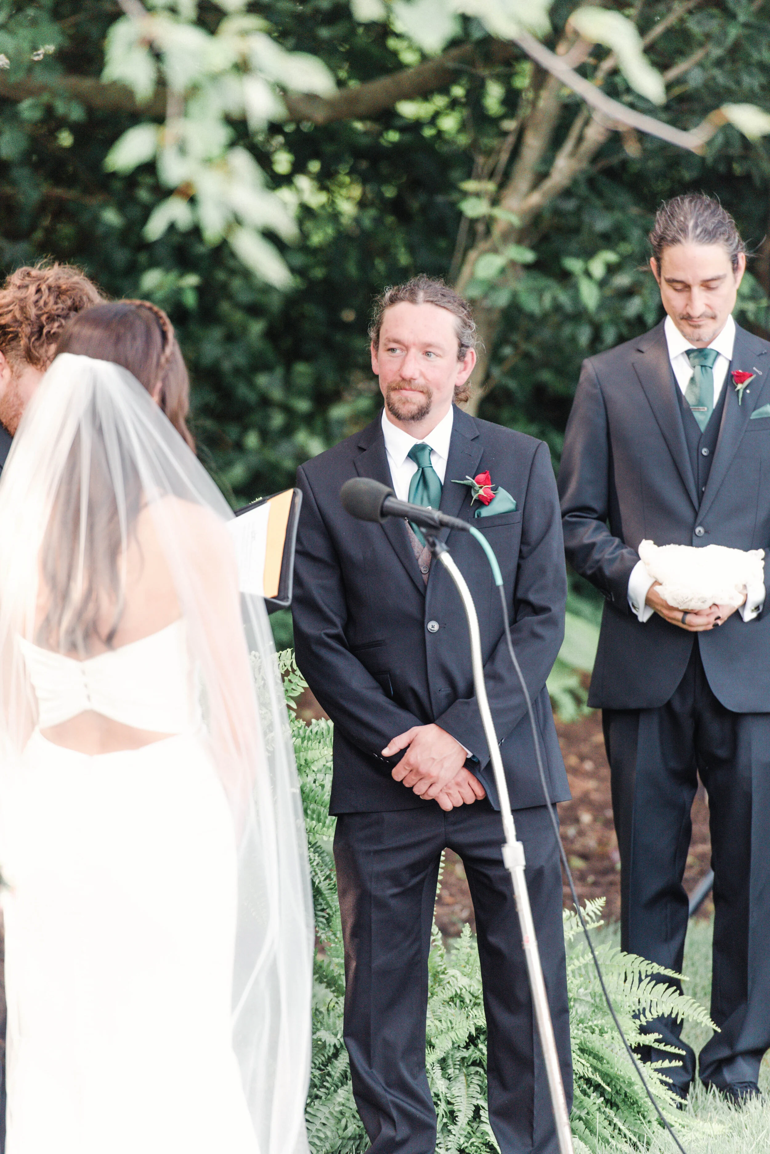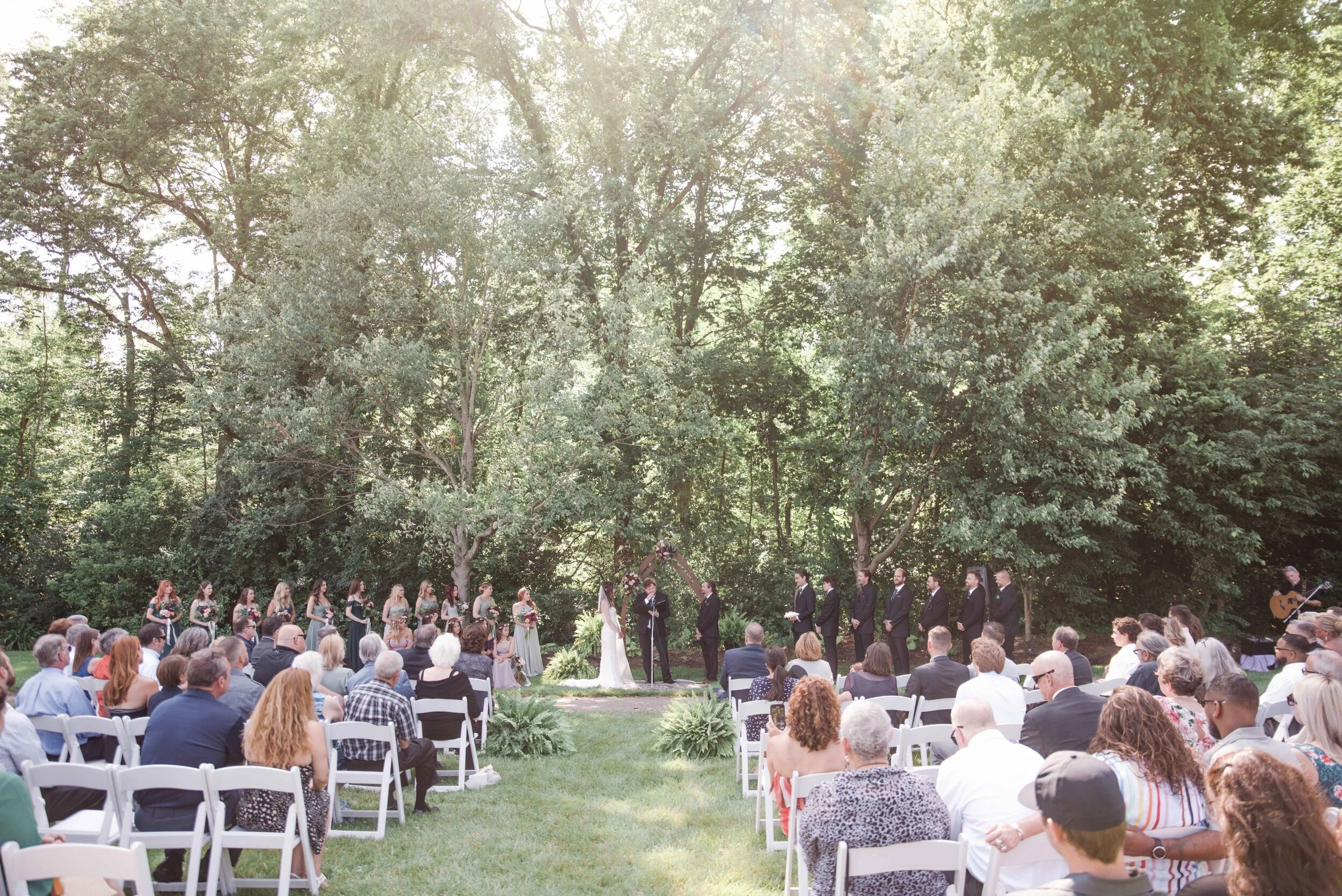 Sunday evening, Samantha & Charles tied the knot in front of their family and friends at the Estate at Sunset Farm. This venue is unique in that you can have your ceremony in so many different locations around the property. Samantha and Charles chose to have their wedding ceremony in the shade of tall trees, with the late afternoon light streaming through the branches. The effect was pure magic.