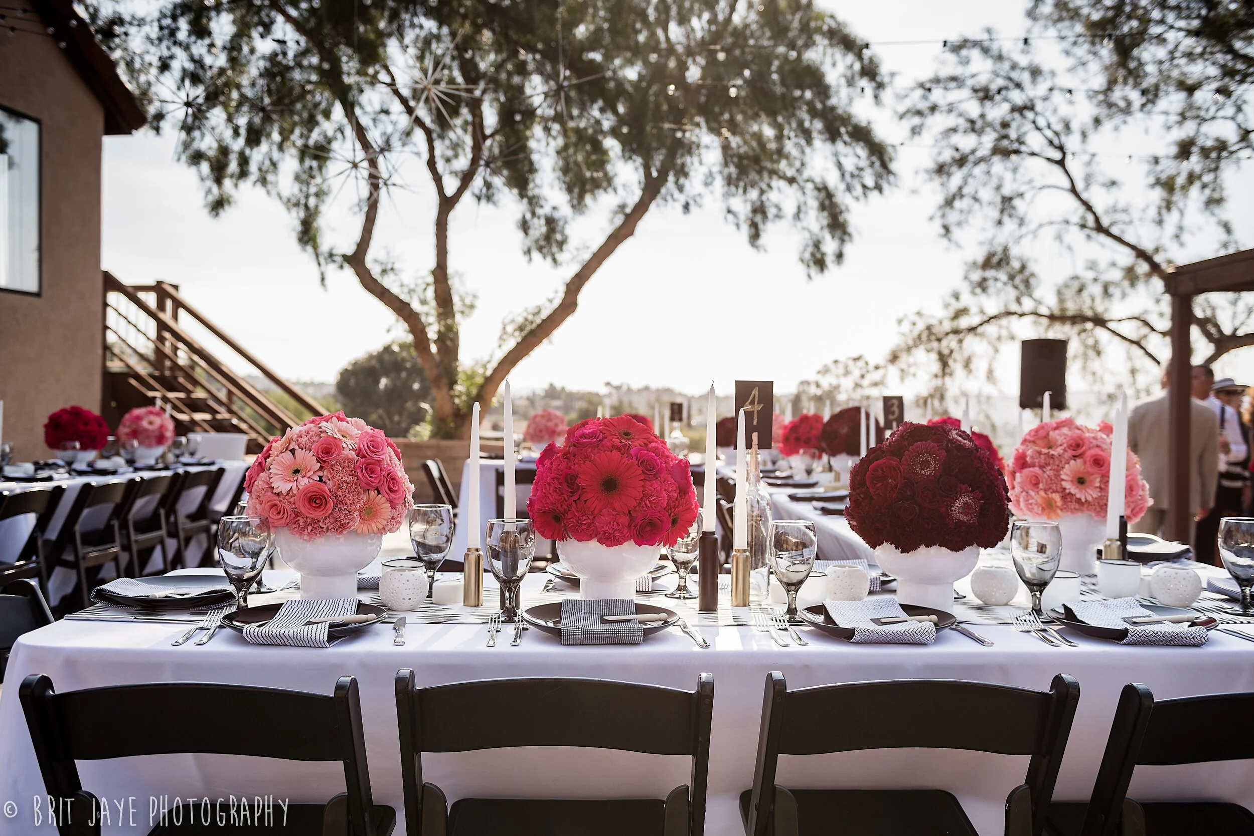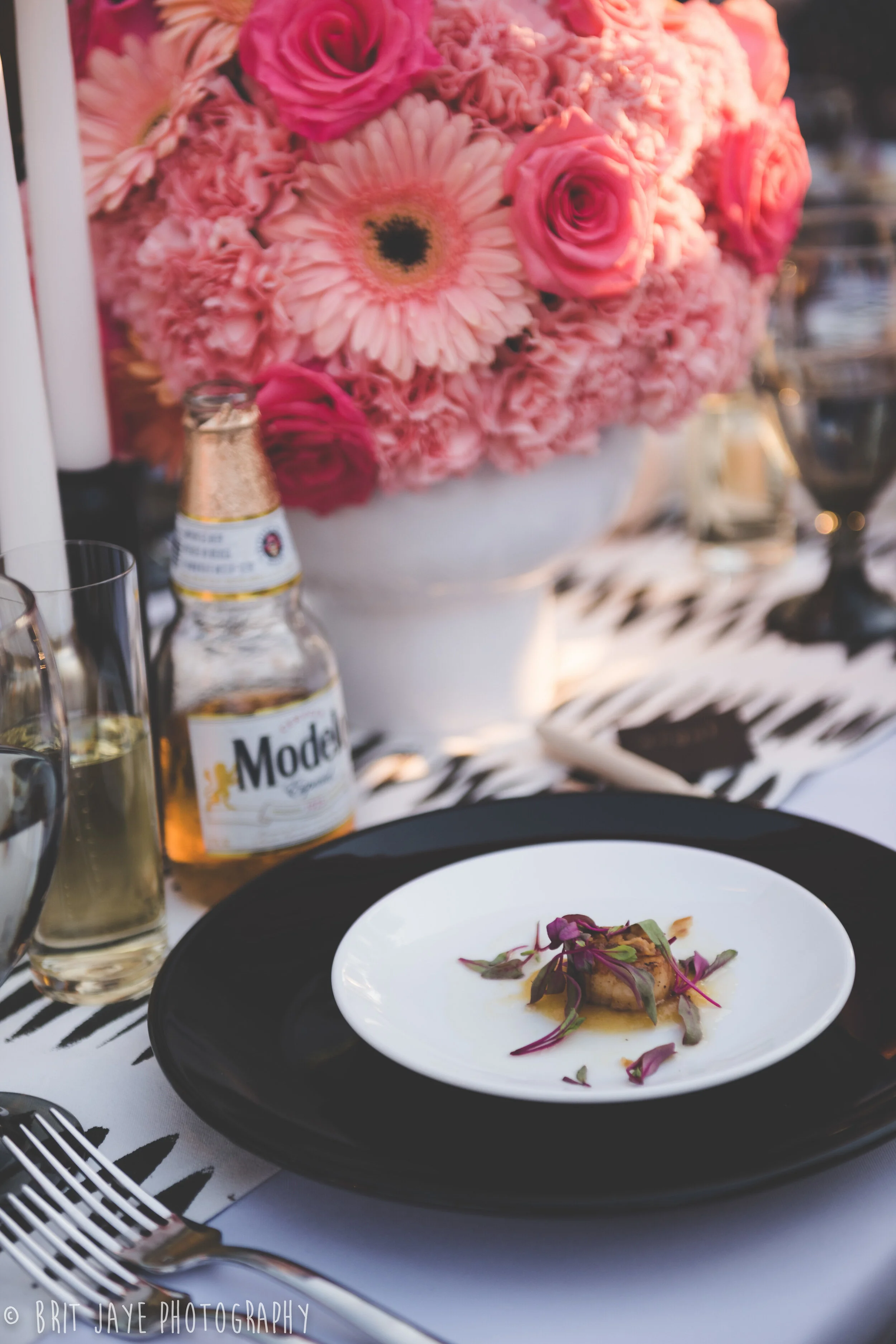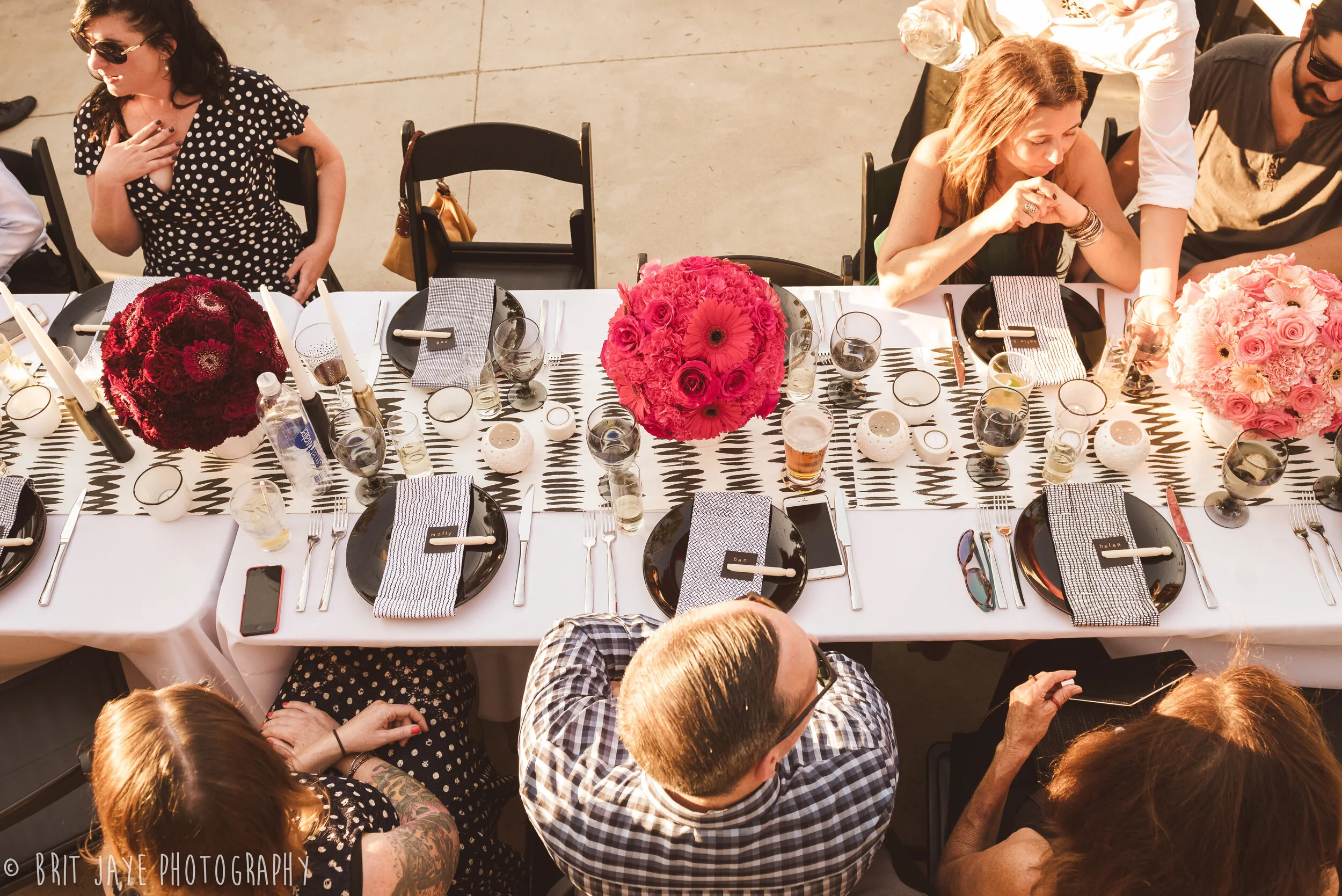 Nicole & Brant tied the knot at Brant’s grandmother’s house, the perfect ceremony location with an gorgeous mountain view. Then guests moved to the bride and groom's house for a backyard wedding reception unlike any other. Nicole's design work is truly incredible. She used a modern color scheme for the reception- black, white & gold with pink ombre accents. The look was modern and whimsical, and every detail was absolutely perfect. Nicole did everything herself, including the gorgeous modern floral arrangements.